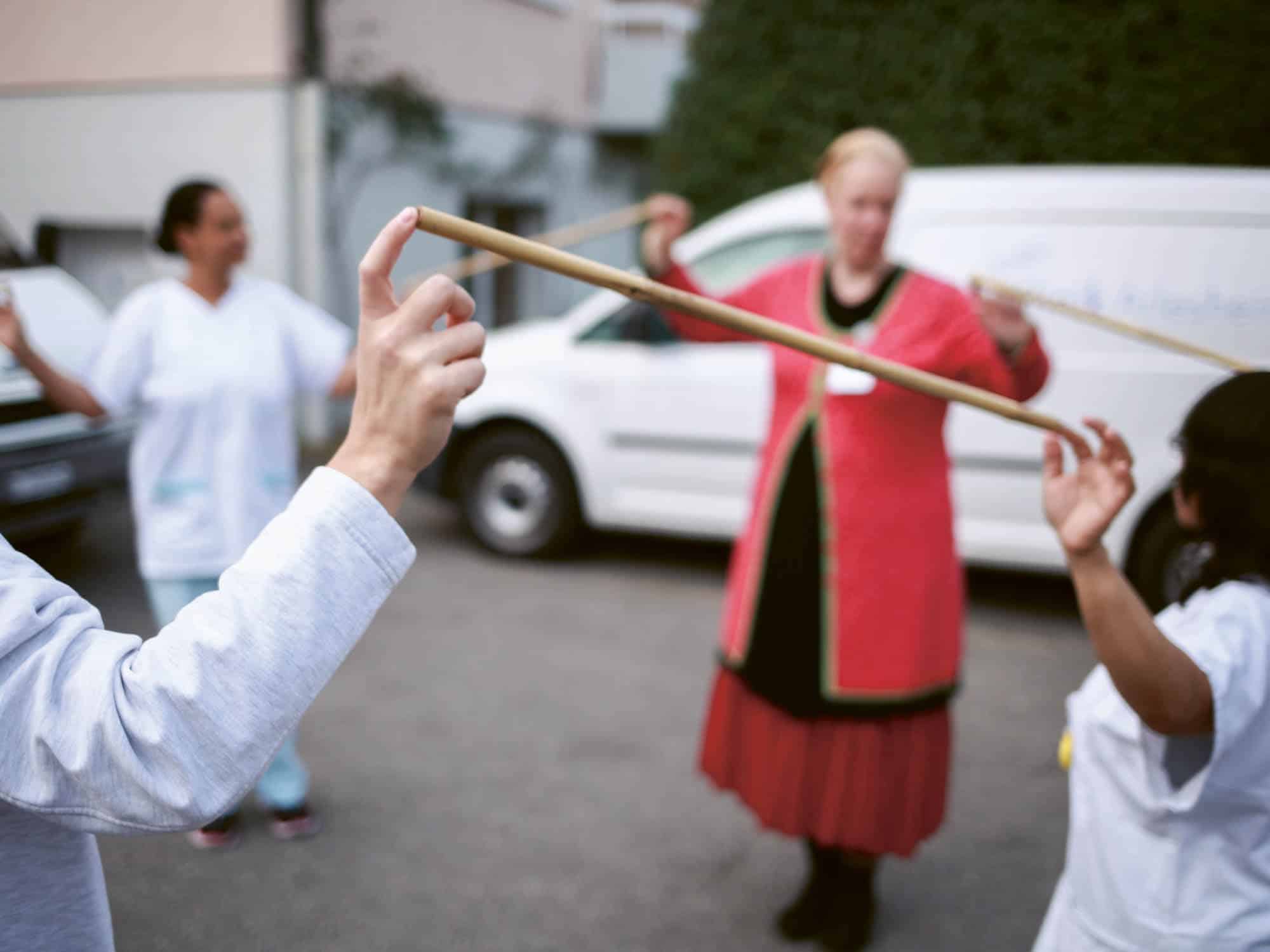 FH In meiner Erfahrung war es auch eine Herausforderung oder Forderung, die eigene soziale Intuition zu entwickeln. Einerseits wahrzunehmen, was sozial an einem Ort läuft, genau hinzuhören und hinzusehen, aber darauf nicht nur mit Gedanken oder Gefühlen zu antworten, sondern mit eurythmischer Fantasie, einem Griff.