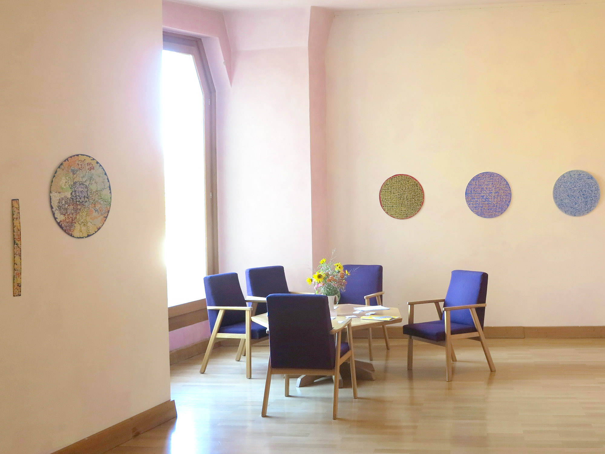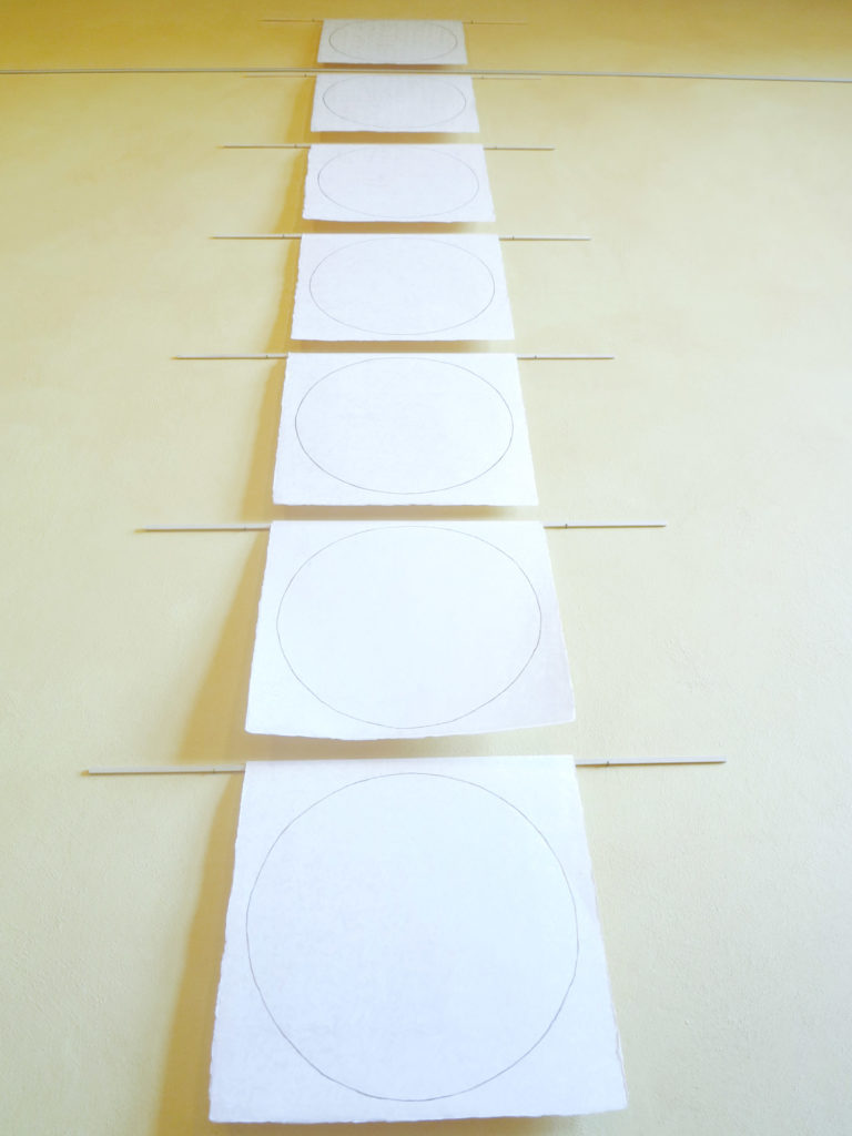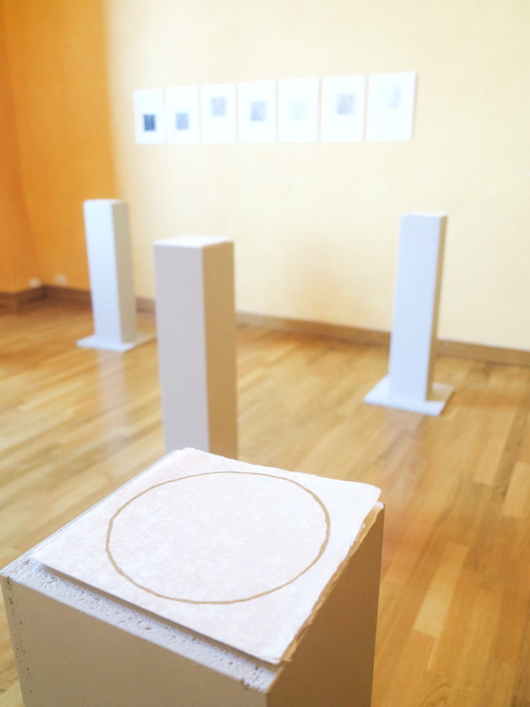 Die sieben Prinzipien des Hermes können in ihren ausgestellten Kunstbüchern gelesen werden. Diese Unikate warten darauf, je auf einem Podest, vom Besucher geöffnet zu werden. Der Buchdeckel zeigt einen mit Muschelgold gezeichneten Kreis auf weißer Schrift. Wie in einer Art von Spiegelung hängen links von den Podesten und den Kunstbüchern, eins unter dem anderen, sieben Schriftbilder mit dem gleichen Motiv des goldenen Kreises. Ein rhythmisierendes Gespräch ergibt sich zwischen den Werken, die – einem unsichtbaren Faden folgend – einen Gedanken aufnehmen und ihn in verschiedenen Variationen entfalten.