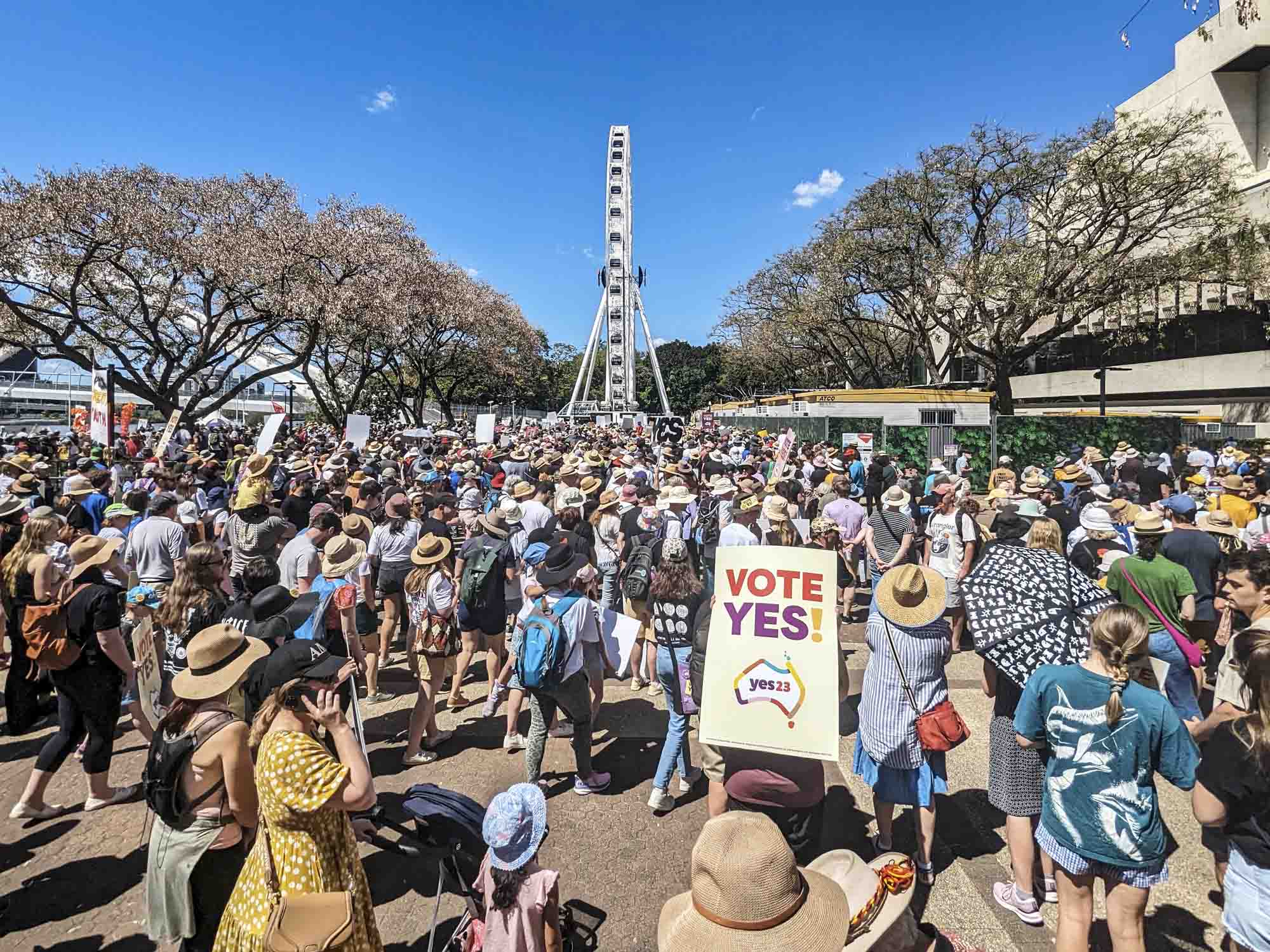 Titelbild Versammlung der Bevölkerung von Brisbane zur Unterstützung des Referendums in Australien, September 2023. Fotoquelle: Wikimedia Commons.