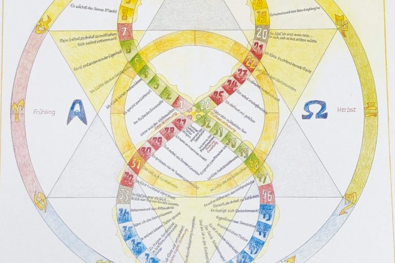 Karlheinz Flau setzt den anthroposophischen Seelenkalender ins Bild. Während im eigentlichen Seelenkalender jeweils eine Woche im Auge ist, ermöglicht Flau den Blick auf das ganze Jahr. Das hilft, den Zusammenhang zu fassen.