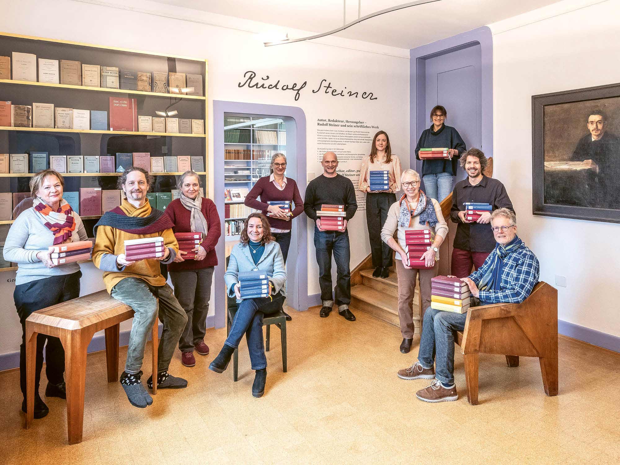 Titelbild Mitarbeitende des Rudolf Steiner Archivs mit den GA-Bänden, die zwischen 2016 und 2025 erschienen sind. 4. v. l. Angelika Schmitt, 2. v. r. Philip Kovce. Foto: Photo Basilisk AG