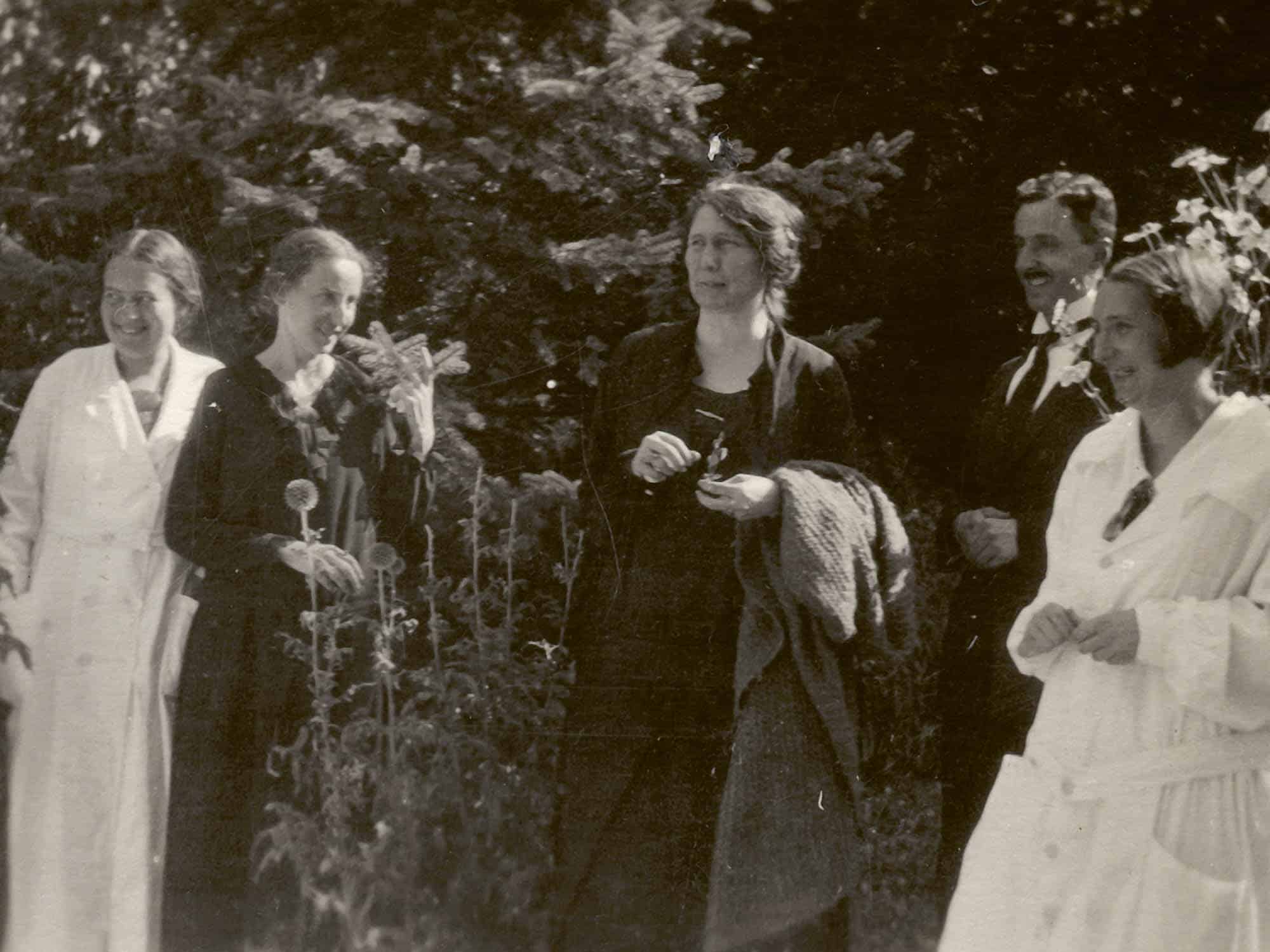 Bild Ita Wegman im Kreis ihrer Kollegen und Kolleginnen, im Garten der Arlesheimer Klinik, 29.9.1926 (v. li. nach re.: M. van Deventer, H. Walter, I. Wegman, E. Schickler, M. Bockholt). Foto: Ita Wegman Archiv, Arlesheim (IWA)