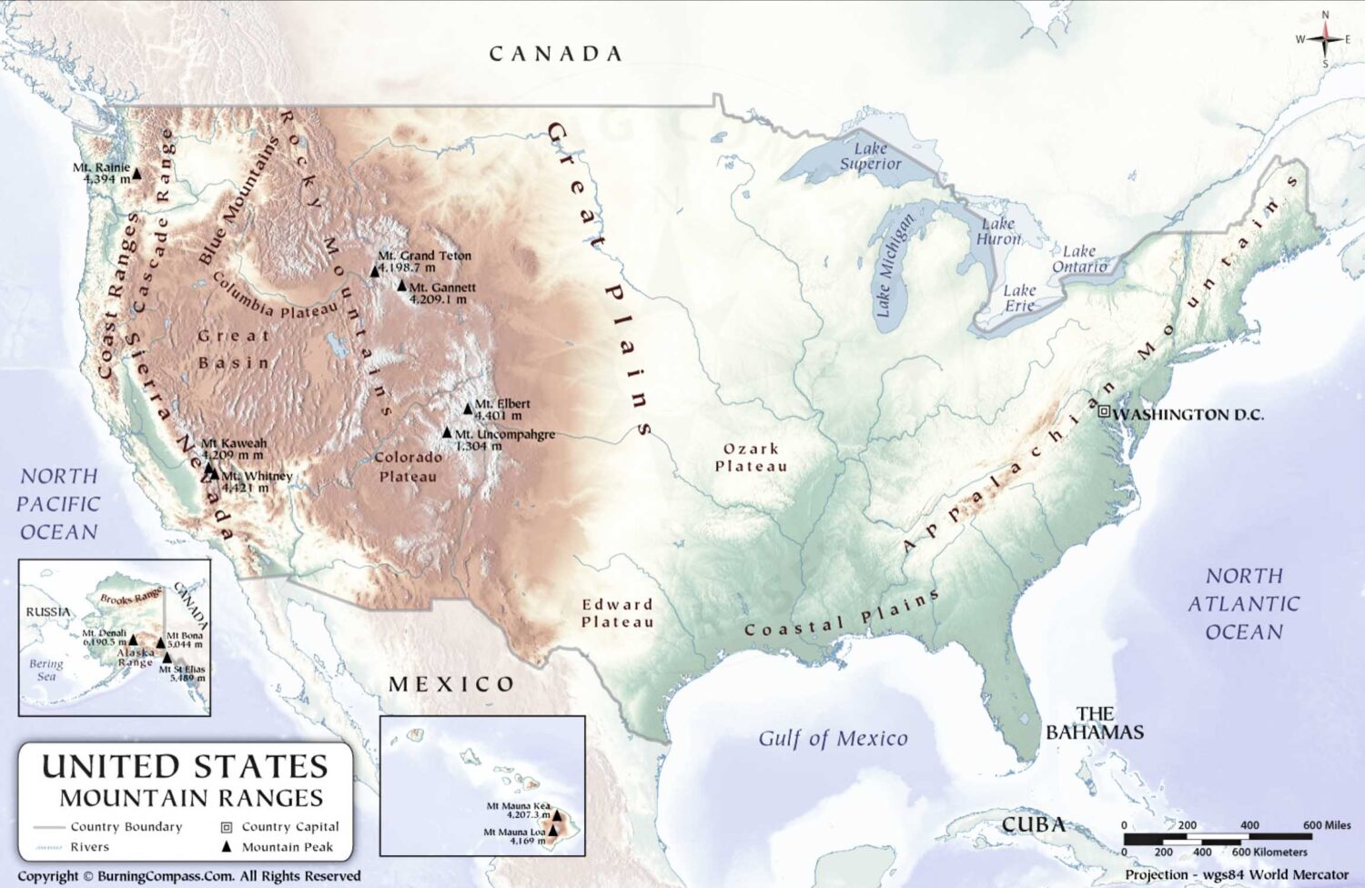 Rechts: Gebirge Nordamerikas (Appalachian Mountain Range und die Rocky Mountains), Quelle: BurningCompass