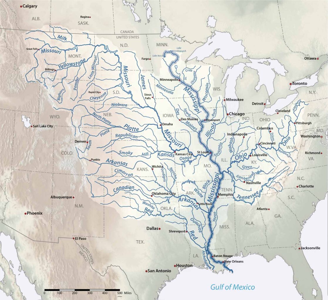 Ich bin auf der westlichen Seite des Appalachen-Gebirges aufgewachsen, das von Georgia nach Maine verläuft. Das Gelände wird allmählich flacher und hügeliger, wenn es sich Memphis nähert. Es erreicht schließlich den Mississippi, eine riesige Wasserstraße, die im Herzen des Landes liegt. Der Fluss wird von Bächen gespeist, die im Osten durch die Appalachen und im Westen durch die Rocky Mountains fließen.