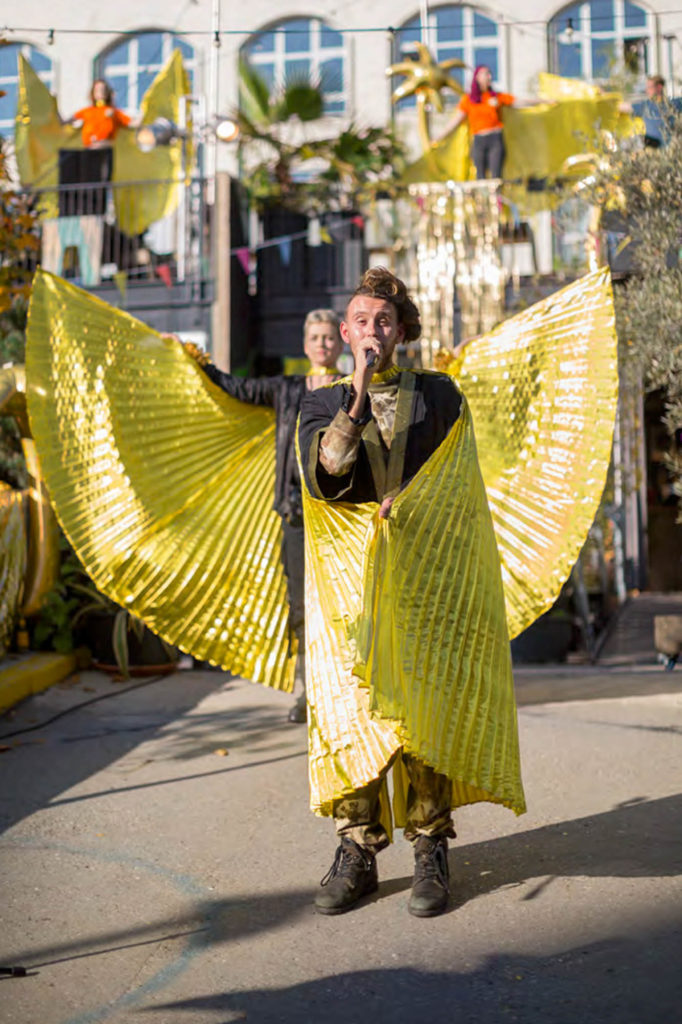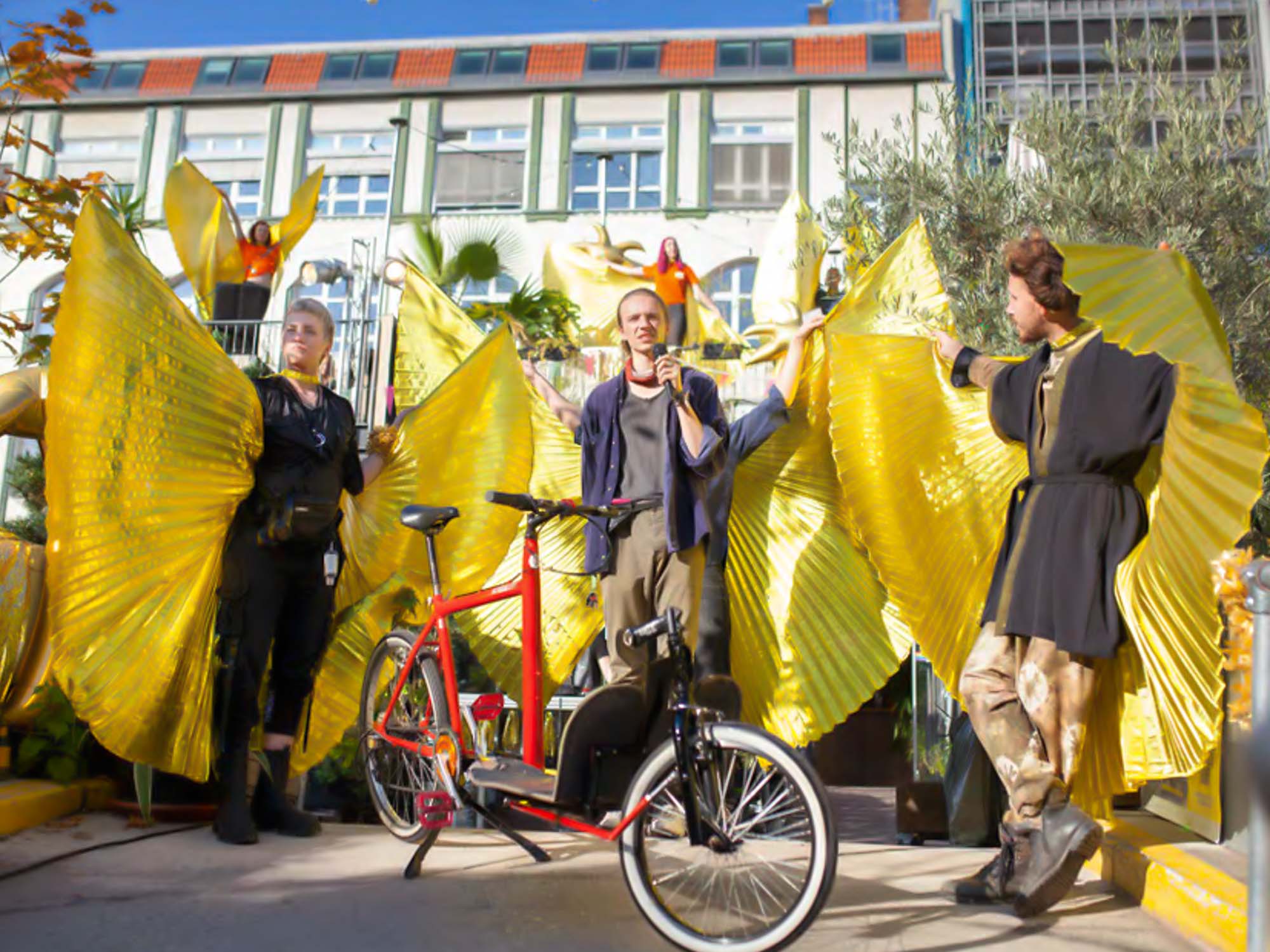 Es war viel Gold dort auf dem sonst recht tristen Parkplatz, wunderschön inszeniert zusammen mit dem Künstler- und Künstlerinnenkollektiv Kernkraft. An sieben Stationen haben Aktivistinnen und Aktivisten eine Initiative präsentiert oder einen Impuls, mit dem sie gerade unterwegs sind. Da waren etwa zwei junge Männer, die sehr erfolgreich Lastenräder ausschließlich aus Schrott bauen, neben ihren politischen Aktivitäten. Besonders stark wirkten auf mich künstlerische Beiträge, die in Abgründe blicken ließen, die Straßenkinder erleben müssen. Es war sehr intensiv. Der Moderator, Simon Hoffmann von der Demokratischen Stimme der Jugend, hat sehr achtsam durch diese krass unterschiedlichen Räume geführt. Da wurden Schmerz und Herzqualität erlebbar, und auch viel Spass daran, in unterschiedliche Lebenswelten einzutauchen.
