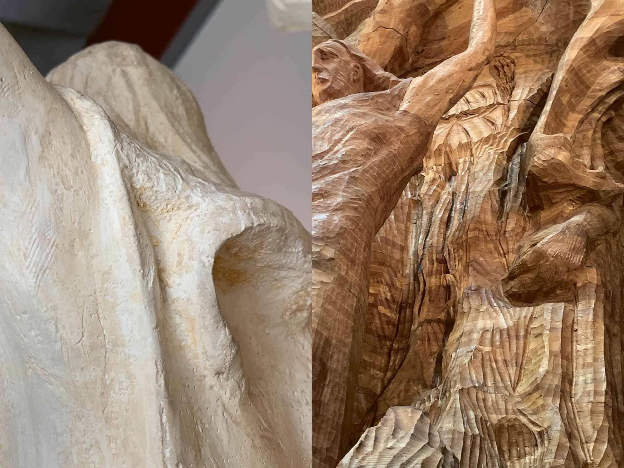 Fragt man sich nach dem Quellgrund dieses Schrittes, so kann man den Zusammenhang mit den beiden erwähnten Bewusstseinssphären leichter nachvollziehen. Es gehört aber noch mehr dazu: Gehen wir zu Maryons und Steiners Gipsmodell, so sehen wir im Rücken der Zentralgestalt eine Höhlung, die sich scheinbar mit den längeren Haaren bildet. Diese Höhlung bildet, wie jede Konkave, ein aufnehmendes Organ, wie ein empfindendes Ohr. Auch wir kennen dieses Organ, wenn wir auf den Raum zwischen unseren Schulterblättern achten. Wir entdecken dort ein starkes Gespür für etwas, das sich hinter unserem Rücken abspielt. Hier ist es die Gestaltung des ‹Felsens›. Aus den Höhen senkt sich ein breiter Strahl, der sich wie eine umgekehrte Glockenblume öffnet, um ihre Spende von einer empfangenden Schale mehrerer Blütenhände aufzunehmen. Das Aufgenommene wandelt sich in eine Art Wasserfall und fließt dann über in Ahrimans strebende Bewegungen. Zu den beiden präsenten Widersachern hin bildet es eine Art Bollwerk, das in seiner Fortsetzung auf der linken Seite der Zentralgestalt, von außen betrachtet, wie eine Art Flügel erscheint. Auf der rechten Seite scheint es nach oben zu pulsieren, um dann überzugehen in den stürzenden Luzifer.