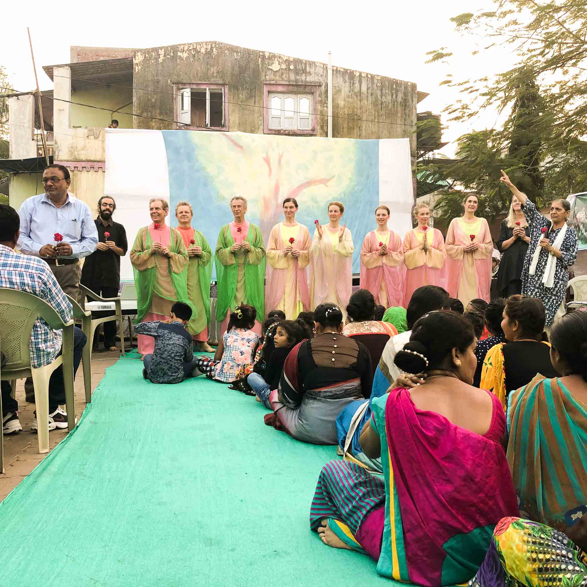 Gleich nach der Ankunft in Mumbai besuchten wir einen Sikhtempel, wo wir mit Gemeindemitgliedern ein vorbereitetes Mittagessen einnahmen. Wir besuchten auch die buddhistischen Kanheri-Höhlen und liefen über die Seebrücke zur Dargha von Haji Ali, einem Sufi-Heiligen aus dem Islam. Die Aufführung in der Inodai Waldorf School war ein riesiger Erfolg. Das Programm, das verschiedene Musikstücke und Gedichte bot, hatte seinen Höhepunkt in der musikalischen Geschichte ‹Peter und der Wolf› von Sergei Prokofieff. Diese Geschichte, die von den Eurythmisten in der schönsten Weise umgesetzt und von exzellenten Musikern und Sprachgestaltern aufgeführt wurde, war der Publikumsliebling bei Jung und Alt. Unsere Besucher genossen das Abenteuer, mit dem Zug in der zweiten Klasse stundenlang von Mumbai zum Dorf Udwada zu fahren. Die anderen Reisenden waren beglückt, mit ihnen zu interagieren. Die Aufführung auf dem Dorfplatz wurde von Hunderten Einwohnern verfolgt, von den Großeltern bis zum Kleinkind, und später tanzten wir alle die traditionellen Garba- und Dandya-Tänze. Wir wohnten hier auch der Aarti-Zeremonie in einem Hindutempel bei und konnten den wichtigsten zoroastrischen Feuertempel der Welt sehen. Udwada war eine portugiesische Kolonie und so gingen wir auch in die Kathedrale Bom Jesus und in andere Kirchen. In Surat und Vadodara waren die Aufführungen für Kinder konventioneller Schulen und ihre Eltern und Lehrer. Dann fuhren wir in eine andere Kleinstadt, Anand, wo wir für zwei Tage auf der biodynamischen Farm Bhaikaka Krishi Kendra blieben. Am Abend fand eine Aufführung für die Bauern und ihre Familien statt, umgeben von Natur und unter hellblauem Himmel. In Ahmedabad konnte die Eurythmiegruppe im schönen Amphitheater der Darpana Dance Academy spielen. In dieser Stadt besuchten wir den Ashram von Mahatma Gandhi. Das Lichteurythmie-Ensemble hat wieder viel Licht und Freude nach Indien gebracht und wir sind sehr dankbar für seine Aufführungen, die immer noch in uns nachklingen.