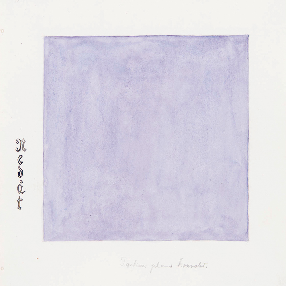 Man kann den Eindruck bekommen, dass sie eher wie eine Wissenschaftlerin als eine Künstlerin arbeitete. Auf der anderen Seite war sie im eigentlichen Sinne ‹inspiriert›. Aber auch hier handelt es sich um einen ‹Auftrag›, um einen Auftrag für den Tempel, an dem sie von 1907 bis 1915 arbeitete. In dieser Arbeit war sie als Medium sowohl in der Ausführung wie auch inhaltlich fremden Kräften ausgeliefert. Ihr wurde gesagt, was sie zu tun hatte. 1916 begann eine neue Werkphase. Jetzt verstand sie sich nicht länger geführt von höheren Kräften. Die Arbeiten werden kalkulierter und erscheinen mitunter als Versuchsanordnungen für visuelle Experimente. Eine Reihe einfarbiger Quadrate aus der Serie ‹Parsifal› sticht heraus. Außer einem in Frakturschrift gemalten Raumadverbial, das eine der Raumesrichtungen angibt – spiegelbildlich, wenn ‹rückwärts›, und von oben nach unten, wenn ‹unten› geschrieben steht –, ist nur ein schnell aquarelliertes einfarbiges Quadrat zu sehen. Auf einem der Blätter steht auf der linken Seite eines Quadrates in gesättigtem Gelb ‹tåkaB› für ‹Bakåt›, was auf Schwedisch ‹rückwärts› heißt. In dieser Arbeit untersucht und differenziert sie die ‹physische Ebene› und in drei weiteren Serien, die betitelt sind mit ‹Das Ätherkonvolut›, ‹Das Konvolut der astralen Kräfte› und ‹Das Konvolut der Denkebene›, visualisiert sie Auffassungs- und Erlebnisformen des Bewusstseins, die sie in der Theosophie und in Steiners Anthroposophie studiert hatte. Hilma af Klints Verbildlichung ist aber, soviel ich weiß, in dieser Form ohne Vorlage und bezeugt ihren eigenständigen Zugang zum Thema.