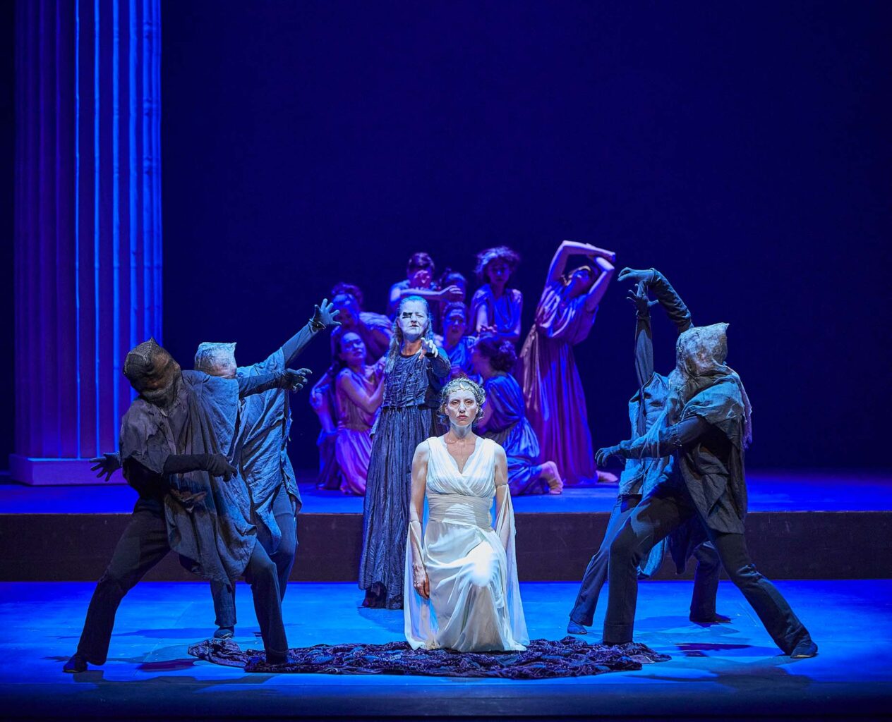 Deswegen ruft Homunculus, das körperlose, wirkungslose, aber weise Wesen, dazu auf, ins antike Griechenland zu ziehen, zum Ursprung des Schönen. Mephisto fürchtet die Antike, weil er sich dort nicht orientieren kann, doch er muss mit, um Faust nicht zu verlieren. Das ist der einzige Moment, bei dem es nicht nach Mephistos Willen läuft, sondern er sich der Schöpfung fügen muss. Homunculus zieht es ebenfalls ins antike Griechenland, weil er erst in der Welt des Werdens einen Körper gewinnen kann, um so Mensch zu werden. Jetzt gehen drei Wesen auf eine Geistesseelenreise in diesem antiken Griechenland. Faust sucht die Helena. Mephisto ist verloren und ist nur dahin zu bekommen, weil Homunculus es ihm gesagt hat. Da gibt es dann auch Hexen, thessalische Hexen, antike Hexen, klassische Hexen. Das Hauptziel für ihn und Homunculus ist, auf der Suche ein Mensch zu werden. Und so sehen wir diesen zweiten Akt eurythmisch in einer geistigen Seelenlandschaft. Sie gehen aber getrennte Wege. Faust trifft auf die Priesterin Mantu, die ihn in die Unterwelt führt, um Helena zu finden, während Mephisto von antiken Hexen in die Irre geführt wird.