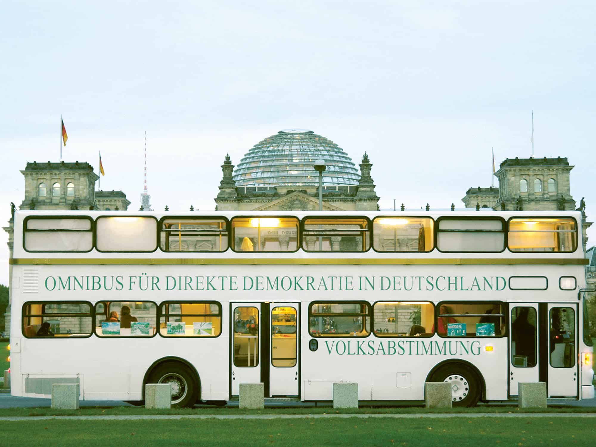 Im Lauf von jetzt 25 Jahren hat er mit unzähligen Menschen über die direkte Demokratie gesprochen, ganz im Sinn der wörtlichen Bedeutung von Omnibus (auf Lateinisch: für alle, mit allen, durch alle). Und auch im Sinn des ‹erweiterten Kunstbegriffs› von Joseph Beuys als praktischer Beitrag zur Arbeit an der ‹Sozialen Plastik›. Im Artikel 20, Absatz 2 unseres Grundgesetzes steht seit 1949, dass wir unsere Staatsgewalt durch Wahlen und Abstimmungen ausüben, wobei nur die Wahlen gesetzlich geregelt sind. Der Omnibus hat einen Gesetzesvorschlag zur Regelung von Abstimmungen im Gepäck, für dessen Verwirklichung inzwischen schon mehr als eine Million Menschen unterschrieben haben. Im Kern geht es darum, dass jeder Mensch die Möglichkeit haben soll, rechtsverbindlich und friedlich in die Gestaltung des Gemeinwesens einzugreifen.