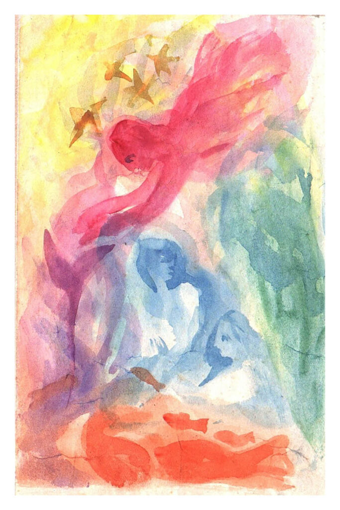 Es ist von allergrößter Wichtigkeit, darauf zu achten, mit welcher Hingabe hier ein Maler mit der Farbe umgeht. Es ist notwendig, lange Zeit dabei zu verharren, zunächst nur das Weben der Farben anzuschauen und mit ganzer Aufmerksamkeit dem lebendigen Werdeprozess, der sich im Farbigen abspielt, in allen seinen unendlichen Beziehungen nachzugehen. Es wird dann mehr und mehr etwas von staunender Ehrfurcht vor dem Farbenleben spürbar werden, etwas von dem Wesenhaften der Farben. Erst von da aus sind wir fähig, die in den Farbenfluten sich bildenden Gestalten in der richtigen Weise wahrzunehmen und zu ergreifen. Sie entstehen wirklich aus der Farbe, jetzt, in diesem Augenblick. Im Grunde erleben wir in dem Bilde den Status Nascendi, den Augenblick des Geborenwerdens der Gestalten. Es wird uns zugleich auch bewusst, dass diese Gestalten gar nicht in eine physische Existenz gehen, sondern in einem geistigen Bereich leben. Deshalb müssen sie auch, anders als physische Körper, in einer transparenten Weise ergriffen werden. Sie sind nur angedeutet, nur so weit sichtbar, dass der Betrachter sie erkennen und in seiner eigenen Seele nachbilden, ausgestalten kann. Diese aktive, schöpferische Tätigkeit wird vom Betrachter verlangt. In diesem kleinen Bildformat ist die ganze Größe des Kosmos zu erahnen: Sterne, schöpferische Genien, Pflanzenhaftes, und unten im flammenden Orange angedeutete Fischformen! In der Farbskizze kann der Tagebucheintrag Prinkes erinnert werden: «In den Farben klingt das Weltall auf.»