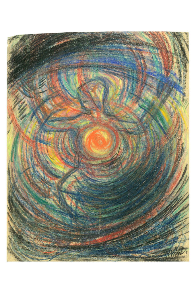Betrachten wir ein weiteres Werk des Künstlers: Kraftende mehrfarbige Linien kreisen in gelb-orange nuanciertem Licht. Von oben, das Bildformat sprengend, strömt eine weitere Bewegung. Alles ist Farbdynamik, aus dem Umkreis strömend in die Mitte, wo eine Figur im Kraftfeld der Linien zu erkennen ist, in der Herzgegend ist der Bildmittelpunkt. Die Gebärde der gewinkelt emporgehobenen Arme deutet die Ka-Gebärde an, die uns als Bild lebendiger Kräfte aus dem Alten Ägypten bereits begegnet!