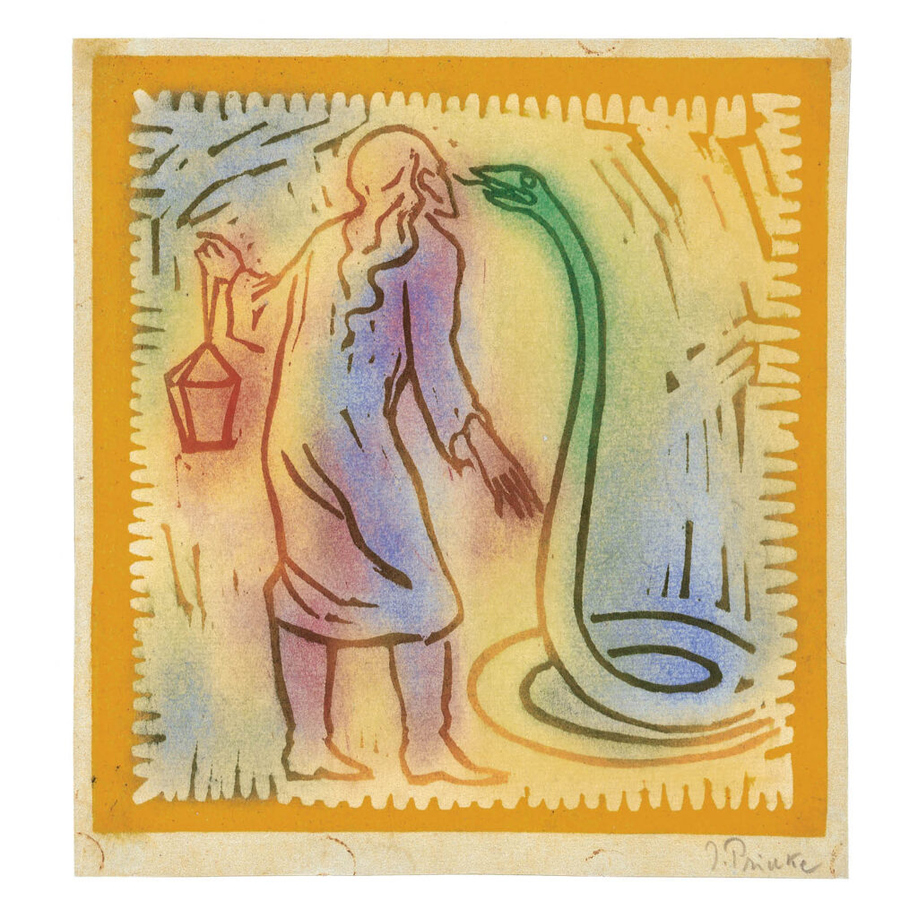 Erhalten sind Farbholzschnitte von J. Prinke zu Goethes ‹Märchen›. Darin ruft der Alte mit der Lampe: «Es ist an der Zeit!» Mit diesen Worten wird im Märchen ein neue Entwicklung eingeleitet, sodass auch Prinke aus dem Rätselmärchen heraus notiert: «Es ist an der Zeit, die innere Wandlung zu vollziehen, ein Mensch zu werden, der die Verantwortung vor der geistigen Welt auf sich nimmt und die moralische Konsequenz daraus zieht.»