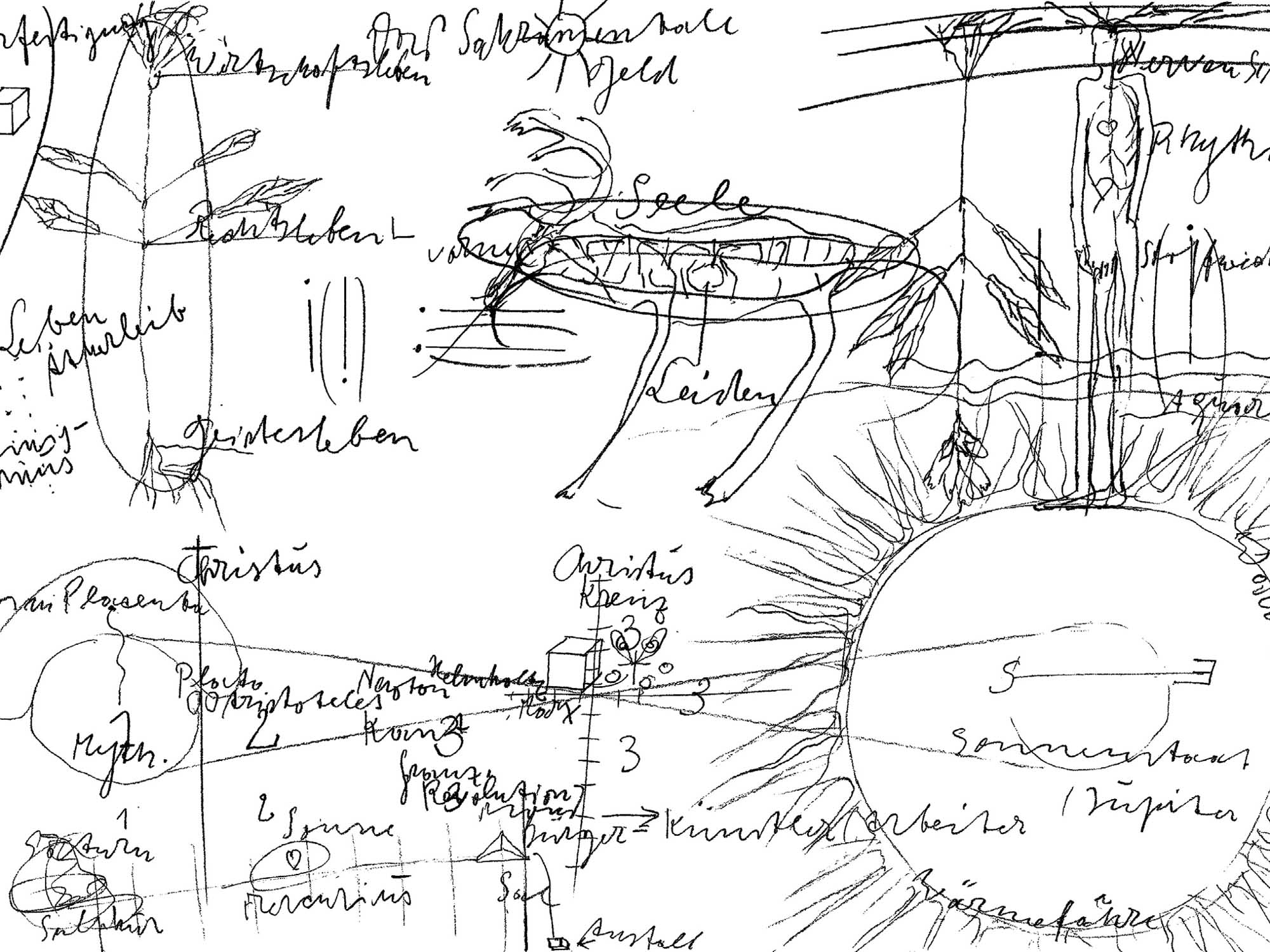 Überraschend dabei ist, dass sich durch Joseph Beuys’ Zeichnungen, plastischen Arbeiten, Installationen sowie Vorträge etwas erschließt, das Rudolf Steiners Überlegungen neu erleben und aktuell werden lässt. Markant wird dies an seinen zahlreichen Zeichnungen und Aktionen zum Thema ‹Evolution›, auf und in denen der dreigliedrige Mensch ebenso erscheint wie der dreigliedrige soziale Organismus und auch Begriffe wie Saturn und Jupiter, Ätherleib und Golgatha oder Sal, Sulfur und Merkur. Auch Beuys ging weit über das Bild von der Evolution hinaus, das Biologen, Geologinnen und Physiker uns lehren. Für ihn ergibt sich erst eine sinnvolle ‹Geschichte› der Evolution, wenn sie als ein Ereignisfeld betrachtet wird, auf dem Mensch, Natur, Kosmos und auch das gesellschaftliche Zusammenleben gemeinsam beackert werden. Für Beuys ist die Fortsetzung der Evolution in unsere Hände gelegt. «Jeder Mensch ein Künstler», erklärte Beuys, ein Schöpfer des Sozialen. Diese Gestaltungskraft jedes einzelnen Menschen, diese Lust, Zukunft zu denken, und diesen Willen, sie durch eigenes Handeln mitzugestalten, brauchen wir heute.