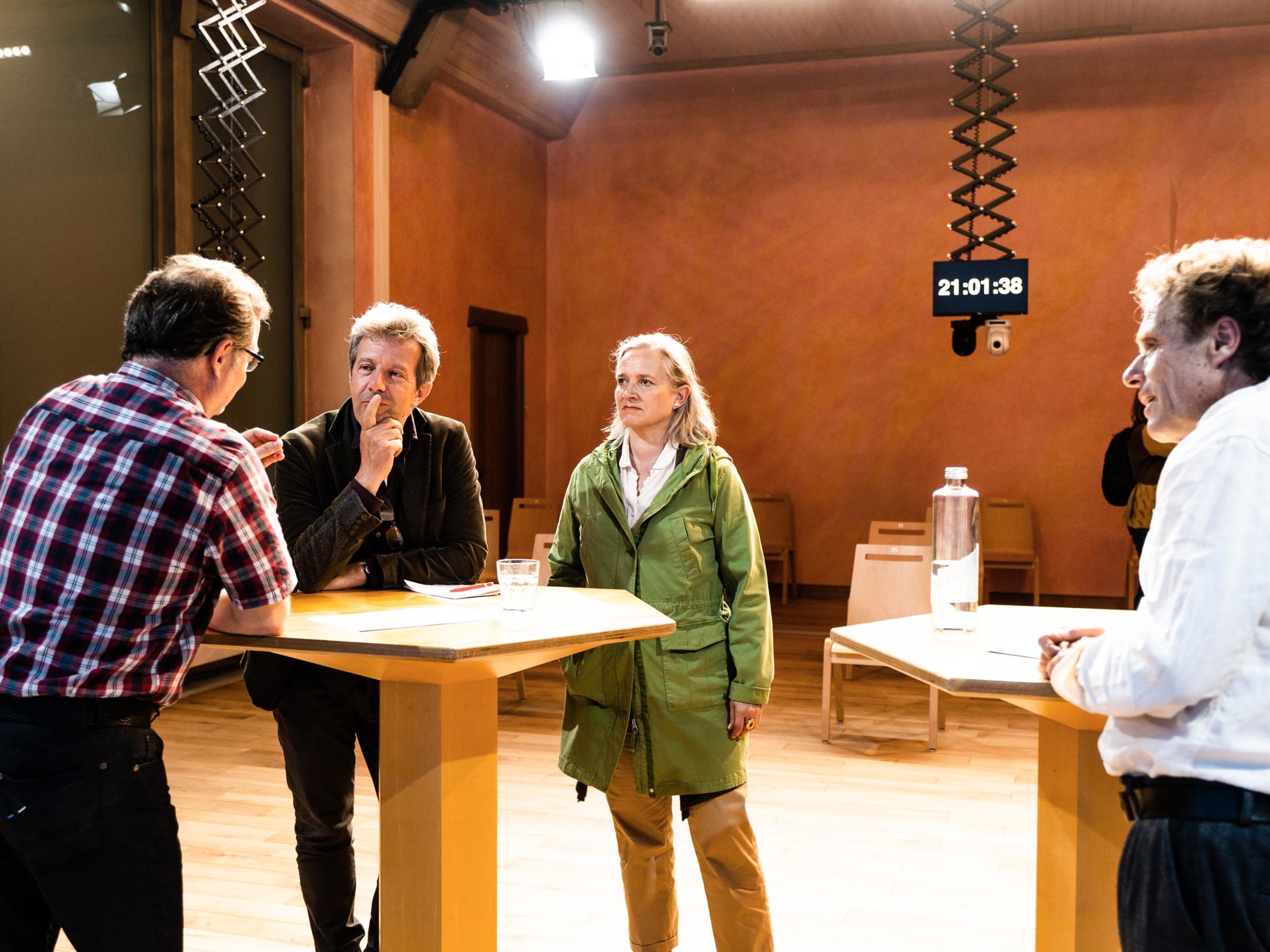 Bild: Mathias Forster, Ueli Hurter, Christiane Haid und Johannes Wirz im Englischen Saal vor dem Dreh der goetheanum.tv-Sendungs ‹Bodennutzung und Klimafrage›. Foto Xue Li