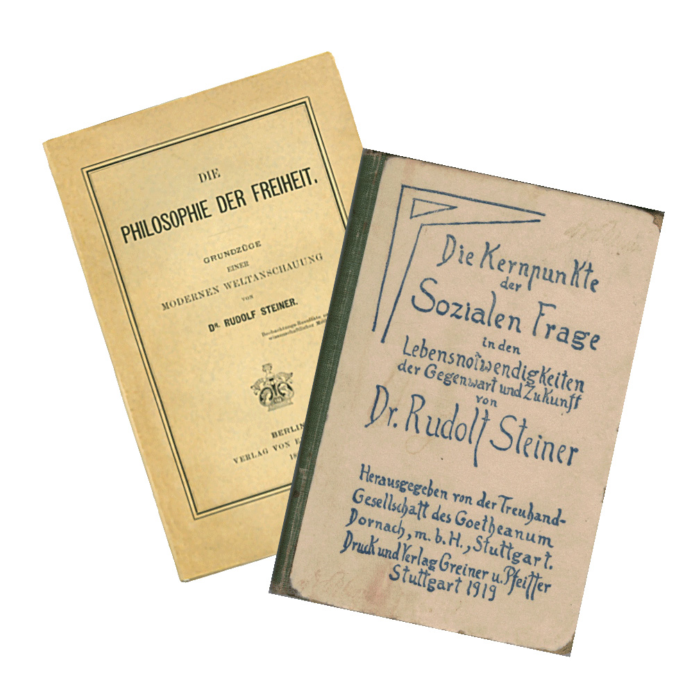 Titelbild: ‹Philosophie der Freiheit› von Rudolf Steiner, Verlag von Emil Felber, 1894 und ‹Kernpunkte der Sozialen Frage› von Rudolf Steiner.