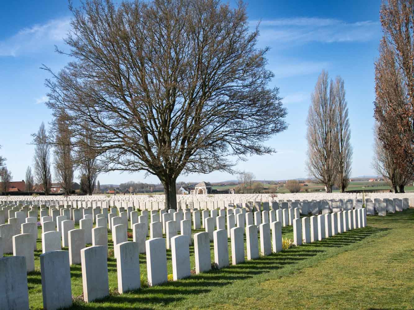 Titelbild Die weißen Gräber gefallener Soldaten aus dem Weltkrieg 1914–18 auf einem belgische Soldatenfriedhof in Westflandern. Foto: CC0 Public Domain.