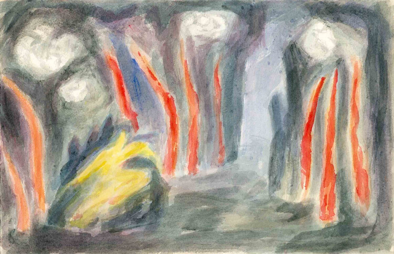 Im Gedächtnis der Dornacher geblieben sind vor allem seine Gemälde nach Motiven aus Goethes ‹Märchen von der grünen Schlange und der schönen Lilie› im Zusammenklang mit Motiven aus Rudolf Steiners Mysteriendrama ‹Die Pforte der Einweihung›. Linde selbst hat seine Studien zu Goethes Märchen – ‹verwoben› mit dem ersten Mysteriendrama von Rudolf Steiner – und sein Leben in und mit den Elementen sehr eindrucksvoll anhand seines Bildes zu Steiners ‹Märchen vom Lieben und Hassen› so beschrieben: «Die Welt der Elemente sieht er [der alte Mann] vor sich eindringen. Felsen werden ihm zu grotesken Naturen, das Wasser zu Wesen, die ihn in den Strudel hinabziehen wollen, die Wolken nehmen Formgestalten an, und in den Blitzen zucken Feuergeister ihm ihre Feuergarben entgegen.»8 Damit greift er einen Gedanken auf, den Rudolf Steiner in seinem Vortrag vom 26. Juli 1914 (GA 291) vor Beginn der plastischen und malerischen Arbeiten im Goetheanumbau seinen Zuhörern gleichsam in die Seele eingeschrieben hat: