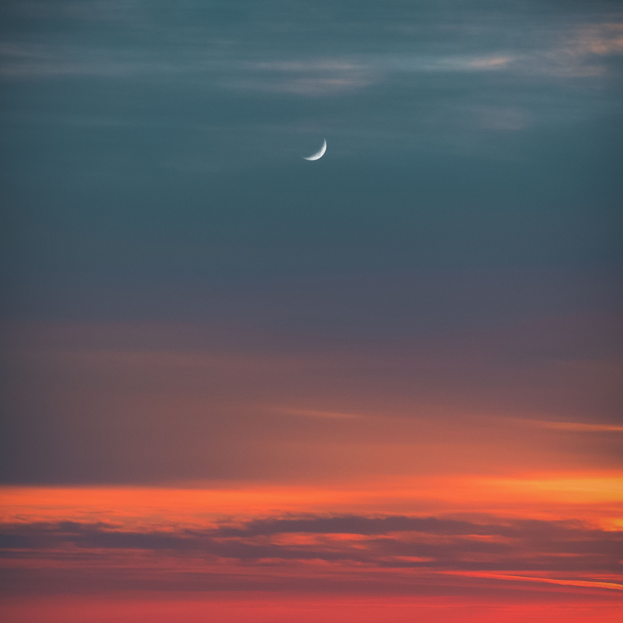 Die noch ganz neue, junge Mondsichel bleibt nur kurze Zeit nah am Horizont sichtbar. Schnell folgt der Mond der untergehenden Sonne, seinem Ursprung, aus dem er vor wenigen Tagen hervorgetreten ist.