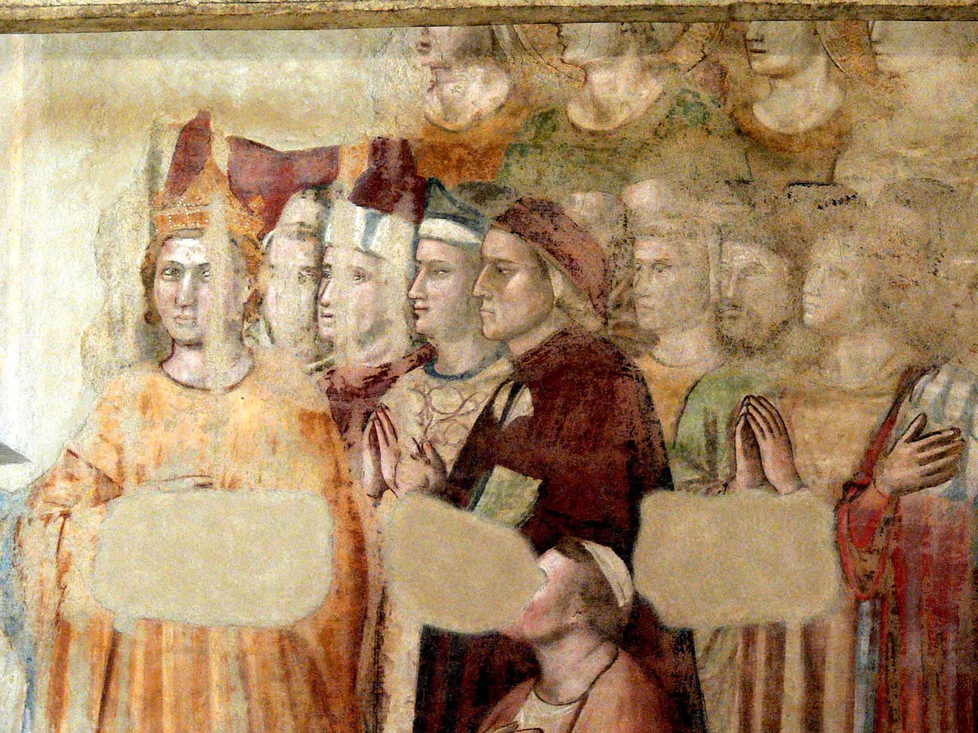 Ob Dante und Giotto sich persönlich kennengelernt hatten, ist nicht bekannt. Auf jeden Fall waren sie Zeitgenossen und beide waren in den mittelalterlichen Städten Italiens sehr berühmt, sodass jeder das Talent des anderen kannte. Sicher ist jedoch, dass die beiden sich gegenseitig sehr wertschätzten. Giotto malte das Porträt des Dichters in seinem Fresko; Dante verehrte Giotto als den besten Maler, als denjenigen, der den Meister Cimabue übertroffen hatte (und gleich danach stellte er sich selbst an den ersten Platz auf dem Feld der Poesie, als besten Vertreter des ‹dolce stil novo›, des neuen Stils, der seinen Ursprung in der provenzalischen Literatur Südfrankreichs hatte).1
