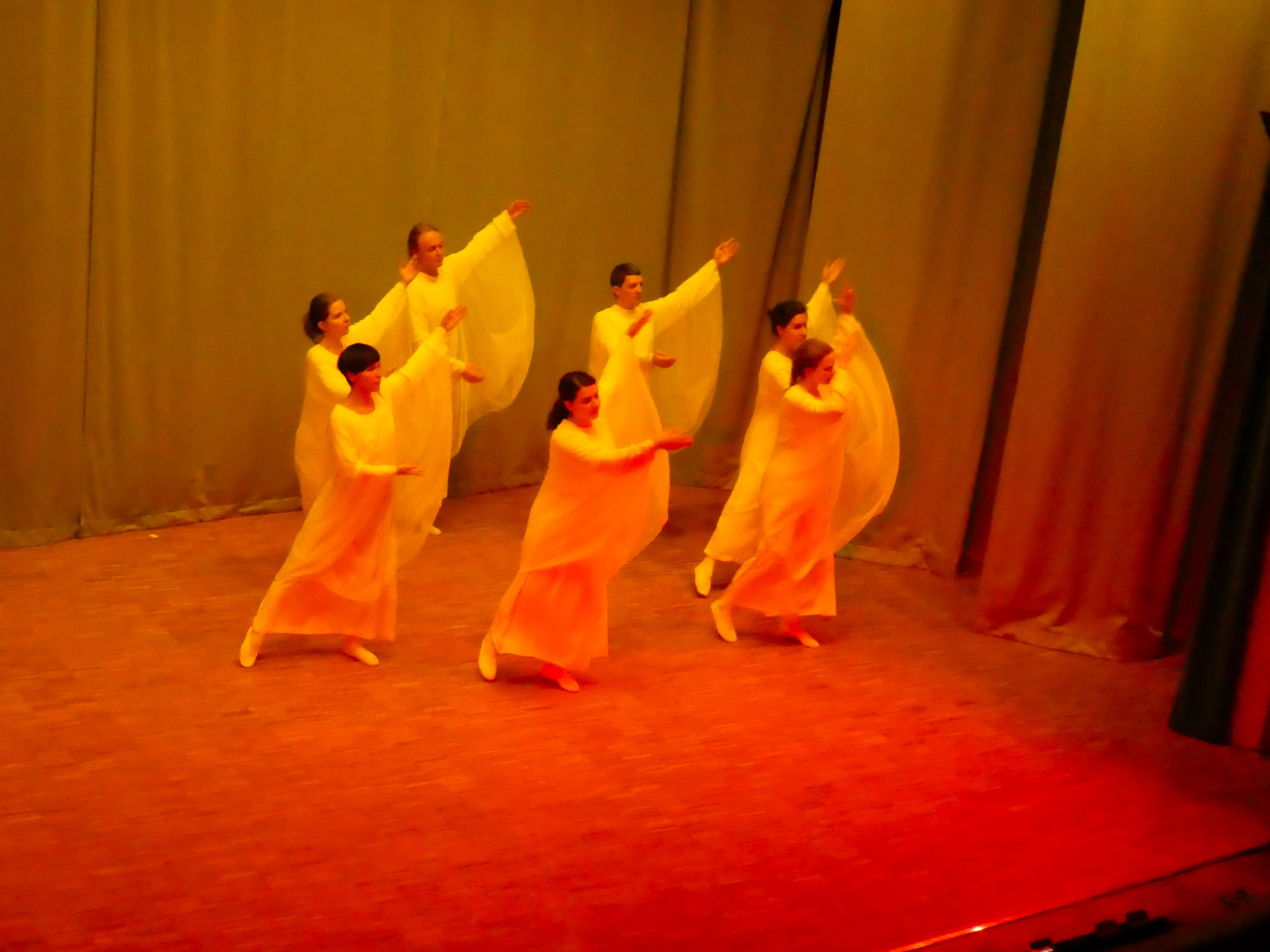 Auf der Eurythmiebühne wurde der Spruch selten sichtbar. Samstag, zwei Tage vor dem Lockdown 2.0 in Berlin, war es aber so weit. Die von Marie Savitch geschaffene und von Helen Reisinger weiterbearbeitete Eurythmieform wurde von Birgit Hering und zwölf Eurythmistinnen rekonstruiert und eingeübt und war der Auftakt zu einer dreieinhalbstündigen staunenswerten Nacht der Eurythmie, der Lichtkunst, der Sprachgestaltung und der Musik. Was sich da entfaltete, sucht seinesgleichen: die Oberstufe der Freien Waldorfschule Dahlem mit Nelly Sachs’ ‹Völker der Erde› und Nerudas ‹Ode an das Leben› (Studierende der Schule für eurythmische Art und Kunst), Freizeit-Kurs Kreuzberger Bodenpersonal mit Rainer Kunzes ‹Raumfahrer› und Goethes ‹Totentanz›, Marie Giest mit ‹Der starke Kaffee›, frei nach Eugen Roth, und Volker Frankfurt mit dem 2. Satz aus der 7. Klaviersonate von S. Prokofieff. War Humor auch dabei? Ja, durch Görner & Häggmark: Umwerfend!2