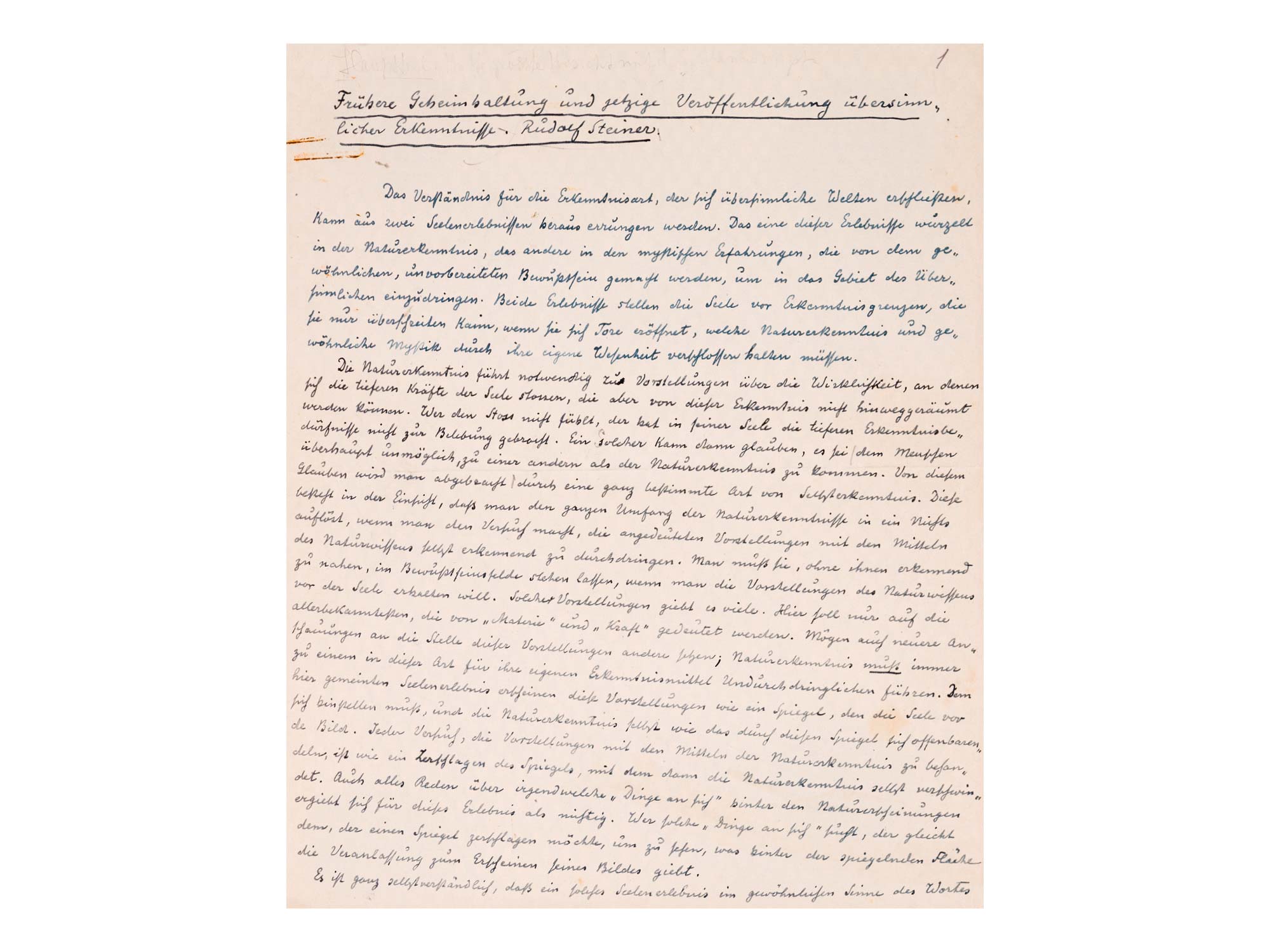 Der Band erschließt ‹entlang der Bilder› die großen Entwicklungsschritte, aber auch Details aus Rudolf Steiners Lebens- und Werkwelt werden immer wieder unvermutet sichtbar – unscheinbare, liebenswürdige und kleine Einzelheiten. Wir erfahren, dass er seinem Wiener Freund Fritz Lemmermayer manchmal mithilfe der ‹pneumatischen Expressbeförderung› schreibt, durch ein unterirdisches Rohrpostnetz, das im 20-Minuten-Takt funktioniert – und sehen das Schriftstück. Wir erfahren, dass der Vater nach einem Heimatbesuch des ältesten Sohnes auf dessen Bitte und nach dessen Vorarbeit 30 Kilo Bücher von Horn nach Berlin sendet – und sehen den Frachtbrief. Wir lesen von Steiners Abwesenheit im Berliner Zweig und sehen das Manuskript seines ‹Apokalypse›-Vortrages, den Marie von Sivers am 7. November 1904 an seiner Stelle vorliest. Wir sind erstaunt, dass der besorgte Vater von Jiddu Krishnamurti am 21.3.1912 aus Adyar sich «vertraulich und privat» an Rudolf Steiner wendet – und betrachten den Brief. Wir sehen an der Rechnung einer Berliner Buchhandlung, dass Steiner im Mai 1917 noch weitere acht Bücher von Franz Brentano kauft, ehe er seinen Nachruf schreibt. Wir können den Einschreibe-Briefumschlag (‹per Eilboten›) betrachten, mit dem er sein Manuskript des Aufsatzes ‹Frühere Geheimhaltung und jetzige Veröffentlichung übersinnlicher Erkenntnisse› im Dezember 1917 an Alexander von Bernus in München für die Zeitschrift ‹Das Reich› sendet – und auf dem Umschlag vermerkt: «Brief mit / Manuskriptbeilage / Wissenschaftlich-philosophischen / nicht politischen Inhalts». Wir nehmen einige der tief betroffenen Beileidstelegramme wahr, die er nach dem Brand des Goetheanum erhält, von den Kölner Zweigen oder der Vidargruppe in Kristiania oder von Jules Sauerwein.