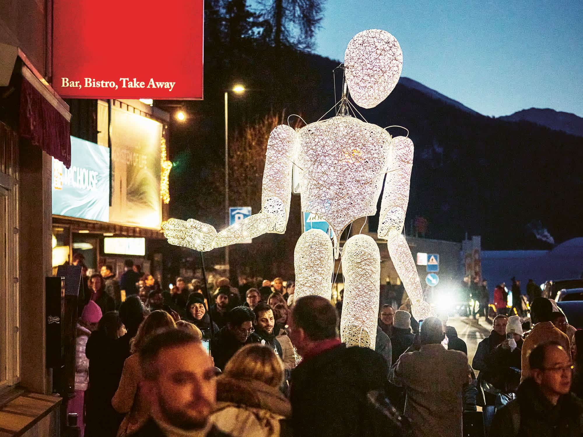 Am Mittwochabend, 21. Januar, war hier das World Child Forum. Nicht im Kongresszentrum, nicht hinter Sicherheitszonen, sondern dort, wo Öffentlichkeit noch möglich ist. Zwei Leuchtpuppen traten auf – eine kleine, eine große. Die kleine erschien zuerst, allein, suchend. Dann erwachte die große, und mit ihr ein Moment, der sich kaum erklären lässt. Erwachsene wurden still. Manche schauten nach oben, andere lächelten unwillkürlich. Für einen Augenblick schien etwas aufzubrechen, das im Alltag des WEF selten Raum bekommt: Staunen.