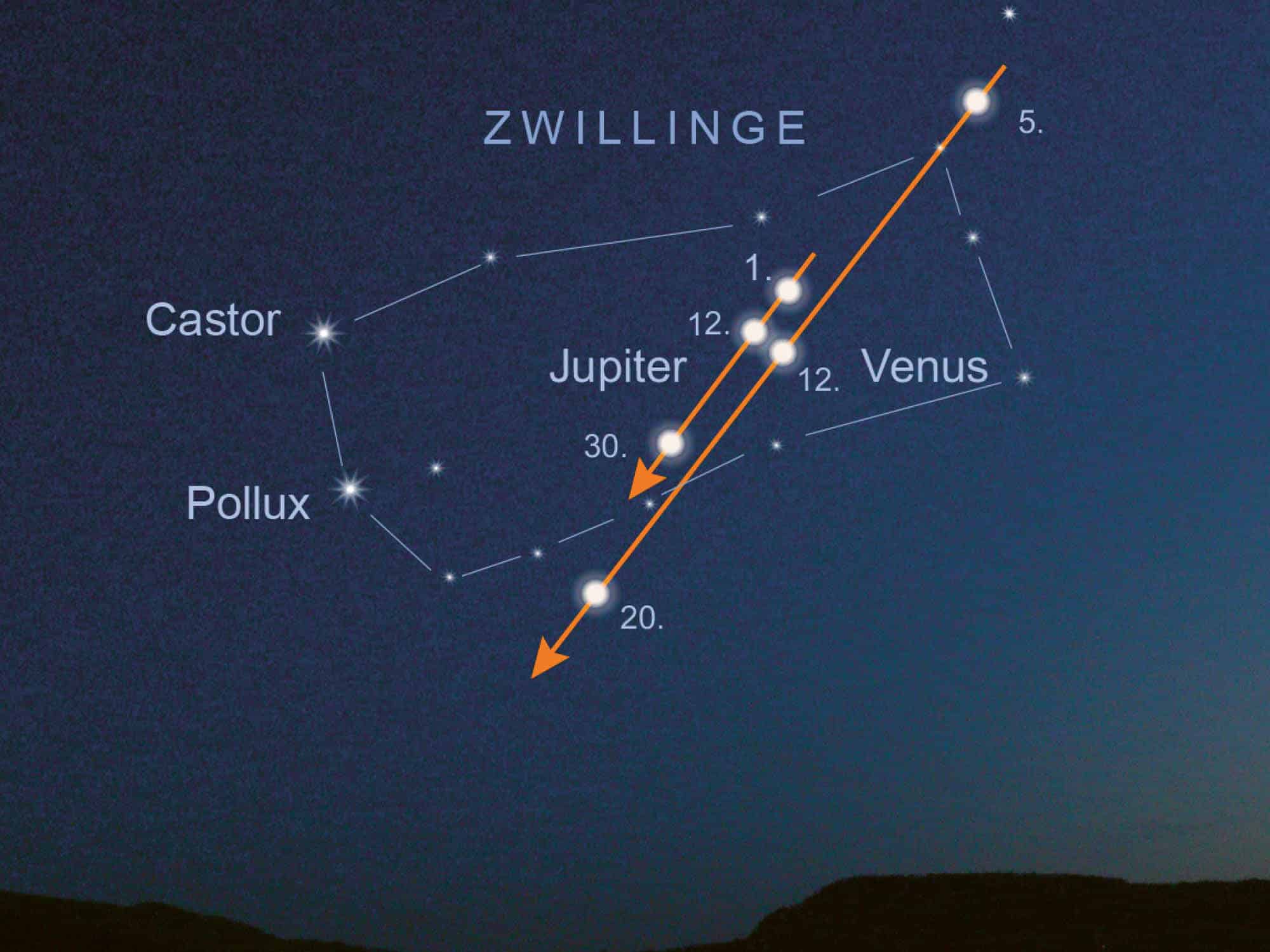We sometimes speak of the rising sun as “making an appearance.” The sun “reveals itself” in its dignity. What we attribute to our main star also seems to me to apply to the constellation appearing in the eastern morning sky in August. In July, Jupiter frees itself from the sun’s radiance and can then be seen on the northeastern horizon. The second act unfolds two weeks later: the stars of Gemini begin to appear around the bright planet, starting with the brightest ones, Castor and Pollux, and soon after, the entire rectangular-shaped star formation shines forth.