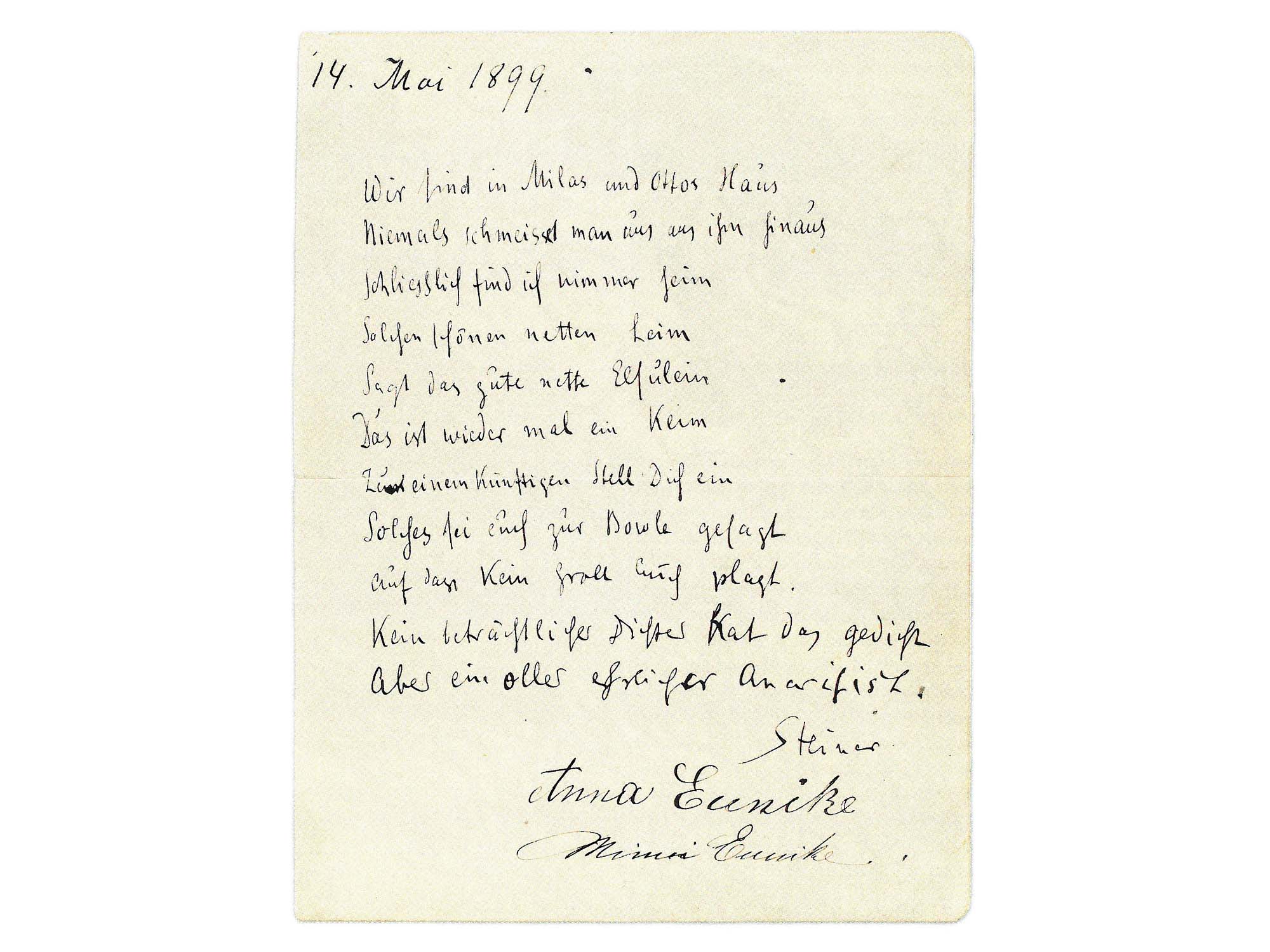 - May 14, 1899. Facsimile in: Rudolf Steiner, Eine Bildbiografie, edited by D. M. Hoffmann, A. Vinzenz, N. Badenberg, St. Widmer, Basel 2021, p. 131. German original: «Wir sind in Milas und Ottos Haus / Niemals schmeisset man uns aus ihm hinaus. / Schliesslich find ich nimmer heim / Solchen schönen netten Leim / Sagt das gute Elsilein / Das ist wieder mal ein Keim / Zum einem künftigen Stell’ Dich / Ein Solches sei euch zur Bowle gesagt / Auf dass kein Groll Euch plagt. / Kein beträchtlicher Dichter hat das gedicht / Aber ein oller ehrlicher Anarchist: / Steiner Anna Eunike Minni Eunike.»