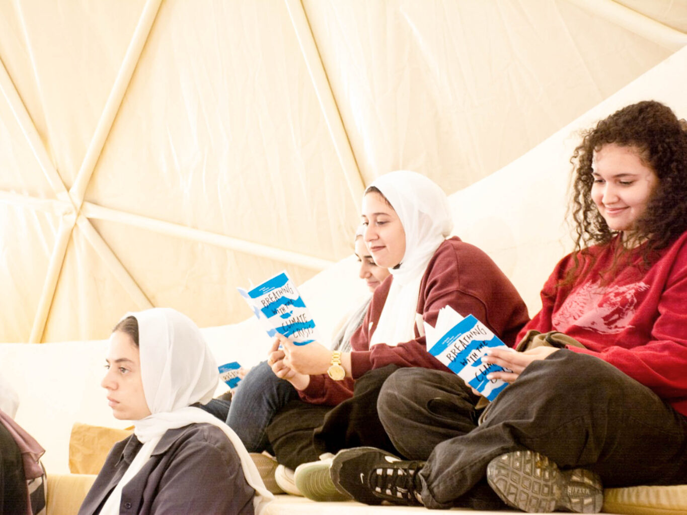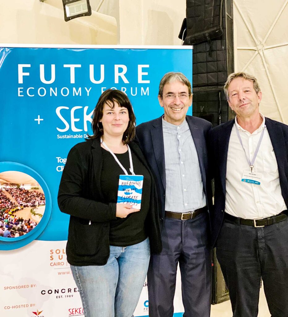 The three of us – Lin Bautze, Ueli Hurter and Johannes Kronenberg – set about working, and at the end of August 2022, we finalised the manuscript of a little book, entitled «Breathing with the Climate Crisis». More stages of publishing followed, in particular, the graphic work by Mark Schalken and the translation into English, Spanish and French. On Friday, November 4th, 2022, Lin Bautze and Ueli Hurter travelled to Egypt – in joyful expectation of the 800 copies which our friends from Sekem printed for us, in order to distribute them at the COP 27 in Sharm el-Sheikh and at their pre-conference meeting at the Heliopolis University in Cairo.