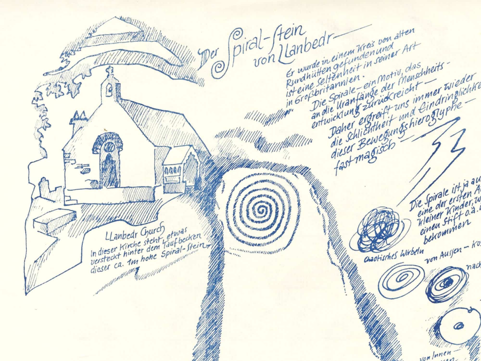 One such sheet, included in Mananaun: Einen Sommer für den Winter [A Summer for Winter] [see image], is the Llanbedr spiral stone found in a circle of old round huts [in North Wales]. The motif of the spiral goes back to the very beginnings of human evolution. We are always struck by the simplicity and forcefulness of this hieroglyph of movement. Flau’s sheet depicts the church in which the one-meter-high stone stands behind the baptismal font. More detailed information about the spiral surrounds the image. It’s “one of the first expressions small children make once they’re given a pencil”: they begin to make chaotic swirls. Then, the movement leads from the outside to the inside. “Rolling out—evolution” (spring, summer) and “rolling in—involution” (fall, winter) are described as primal gestures. Flau describes the stone as a true inspiration stone, which further stimulates him to write down his thoughts: “[T]he jumping point” sucks, condenses, and swells, dissolving where the two meet. And then he comes to the turning point. At the bottom left of the sheet is the stone with the Celtic cross with figure and spiral that stands in Llanbadarn Fawr, Wales.—Peter Stühl