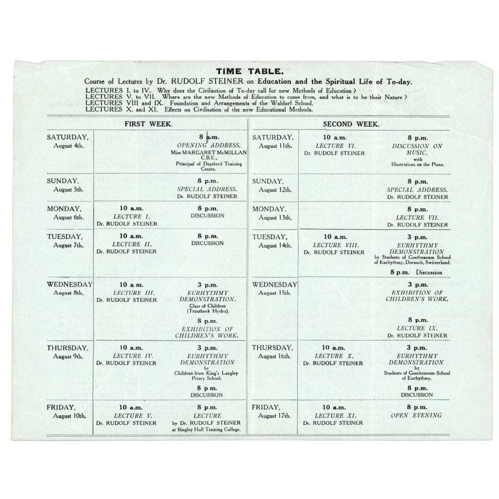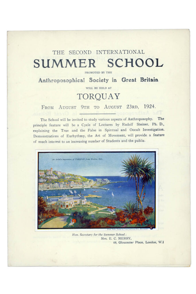 Left: Flyer announcing the summer school in Torquay; right: program and schedule for the teacher training course in Ilkley. Rudolf Steiner Archive, Dornach.