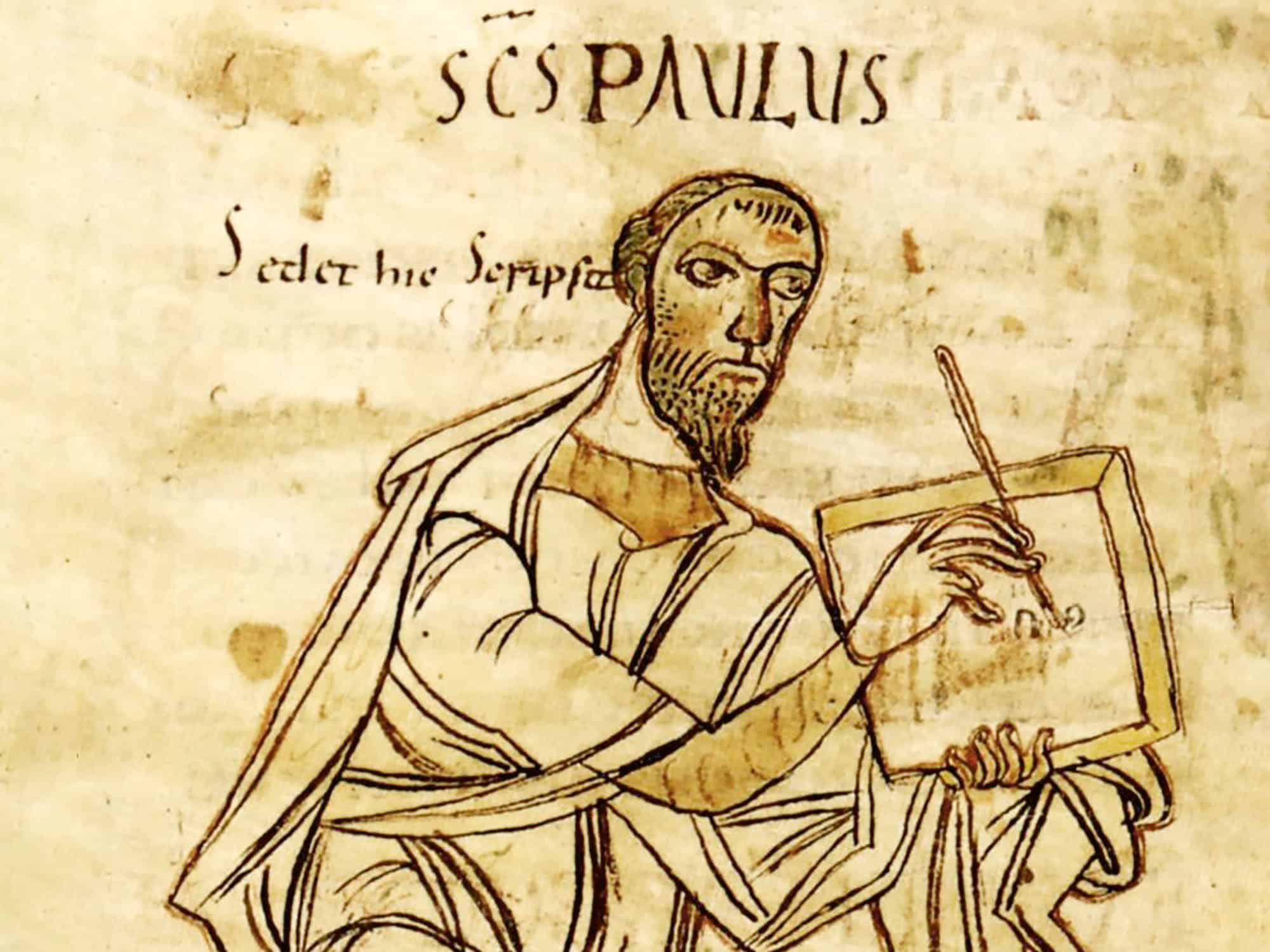 Image Miniature in the St. Gallen manuscript of the Pauline letters, first half of the 9th century. It is considered to be one of the oldest depictions of Paul in European art. The inscription reads: “Saint Paul sits and writes.” (Edited)