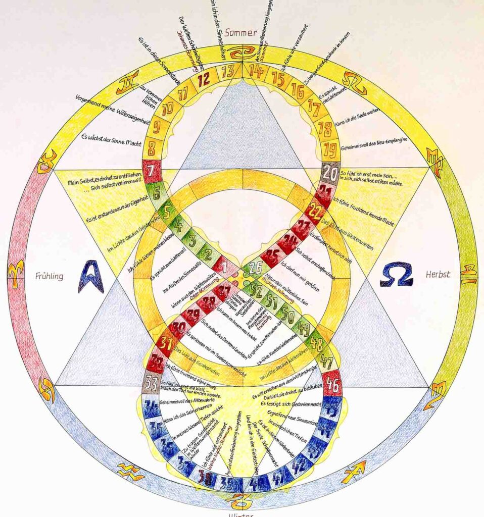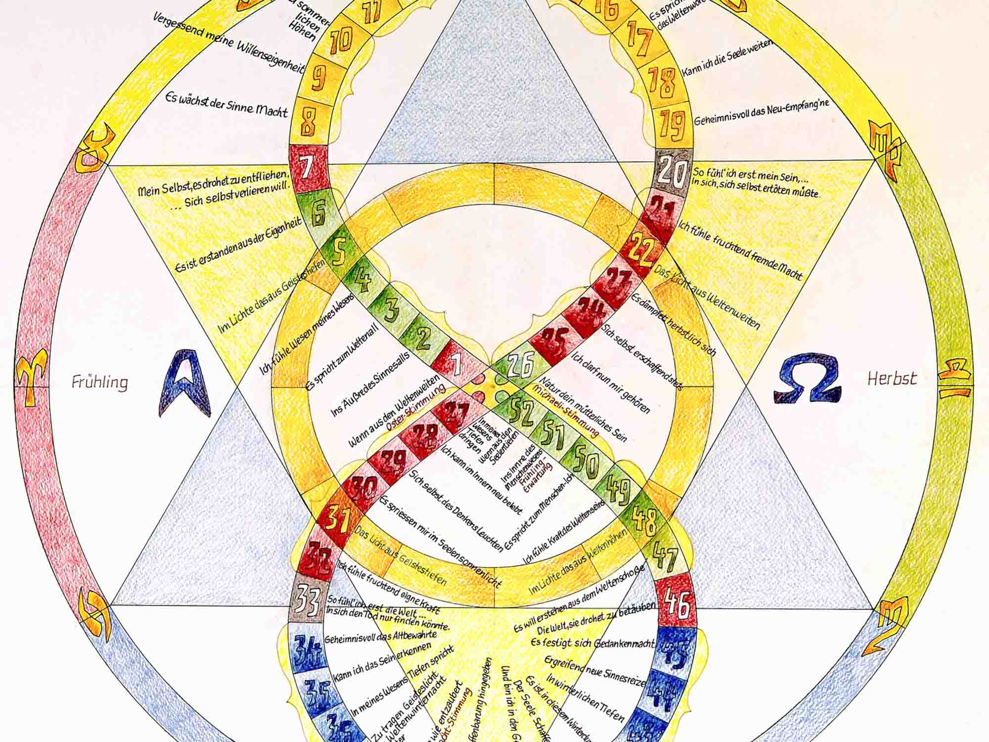 We received stimulus for contemplation of the fourfold-verse from Karl König’s work Anleitungen zum Seelenkalender: Der Anthroposophische Seelenkalender als innerer Wandlungsweg (Stuttgart 2009).9 Here, we let the current weekly verse, its mirror verse, its counter verse, and the counter-verse’s mirror verse all live within the soul at the same time. This results in 13 quartets of verses. Contemplating the verses in this way, we can look for a possible relationship between the four verses. Just as there are several interpretations, several relationships can be found. What can we achieve by contemplating the verse quartet? Our spatial and temporal awareness is sharpened, because with each verse quartet we bring into view both the northern and the southern hemispheres of the earth and all four seasons. As we already did in the mirror verses, we live into the “double stream of time,” because the past works on continuously and at the same time something continuously approaches us from the future. In addition, the soul experiences its own growth in the course of the year—through natural processes, through work on ourselves, and through our work in the world. The soul finds itself—the everyday self connects to the higher self that is not embodied. The soul achieves the connection to spiritual reality only through its own faculties (thinking, feeling, willing). It feels, cognizes, and wills itself as a part of world revelation, as a spirit being that is temporarily integrated into the natural processes. We can also characterize the value of the quartet observations in the following way: the weekly verses are a path to self-knowledge, self-awareness, and self-education. They clearly point out the connection of the soul with nature and the suprasensible world of being. We come to know how the soul grows when it works on itself, and how it is supported by nature and the cosmos. A way is shown to the World Spirit, to Christ; suprasensible perceptions (imagination, inspiration, intuition) are prepared; truth-thinking, truth-feeling, truth-willing are sown.