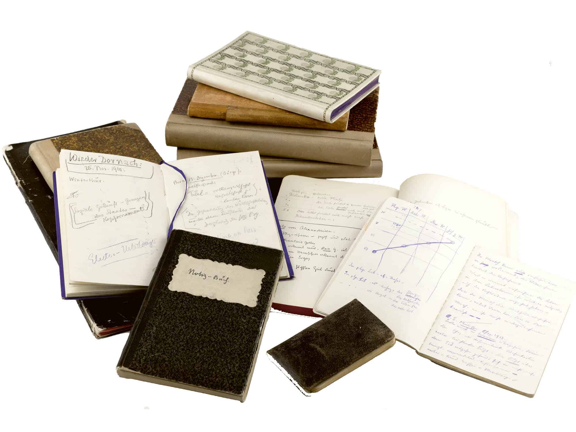 Rudolf Steiner recorded all kinds of thoughts in innumerable notebooks, pads, and individual sheets of paper in a wide variety of colors, shapes, and designs. These include individual manuscript pages, fragments, and preliminary versions of essays, as well as drawings, drafts of letters, eurythmy forms, attempts at finding words, appointments, and calculations. In addition to the usual bound and mostly unlined notebooks (such as a series bound in violet wax cloth from 1919/1920), there are also (sometimes self-made) leporellos, ring binders, notebooks, address books, and calendars, as well as unusual extra-long formats and miniature sizes. The entries are usually in pencil, black ink, or purple crayon. The notes are even more individualized; with their different formats, types of paper, and folds, they offer a wide range of design possibilities that Steiner often knew how to exploit extremely creatively. The notes make visible the creative processes of thought (and dead ends) precisely through their material, as evidenced by the notes that former coworkers would salvage from the trash. Even today, you can still see that some of them were crumpled (e.g., NZ 58) or, like NZ 1, folded into an unsuitable miniature format and rolled (maybe simply to stabilize a wobbly table?)
