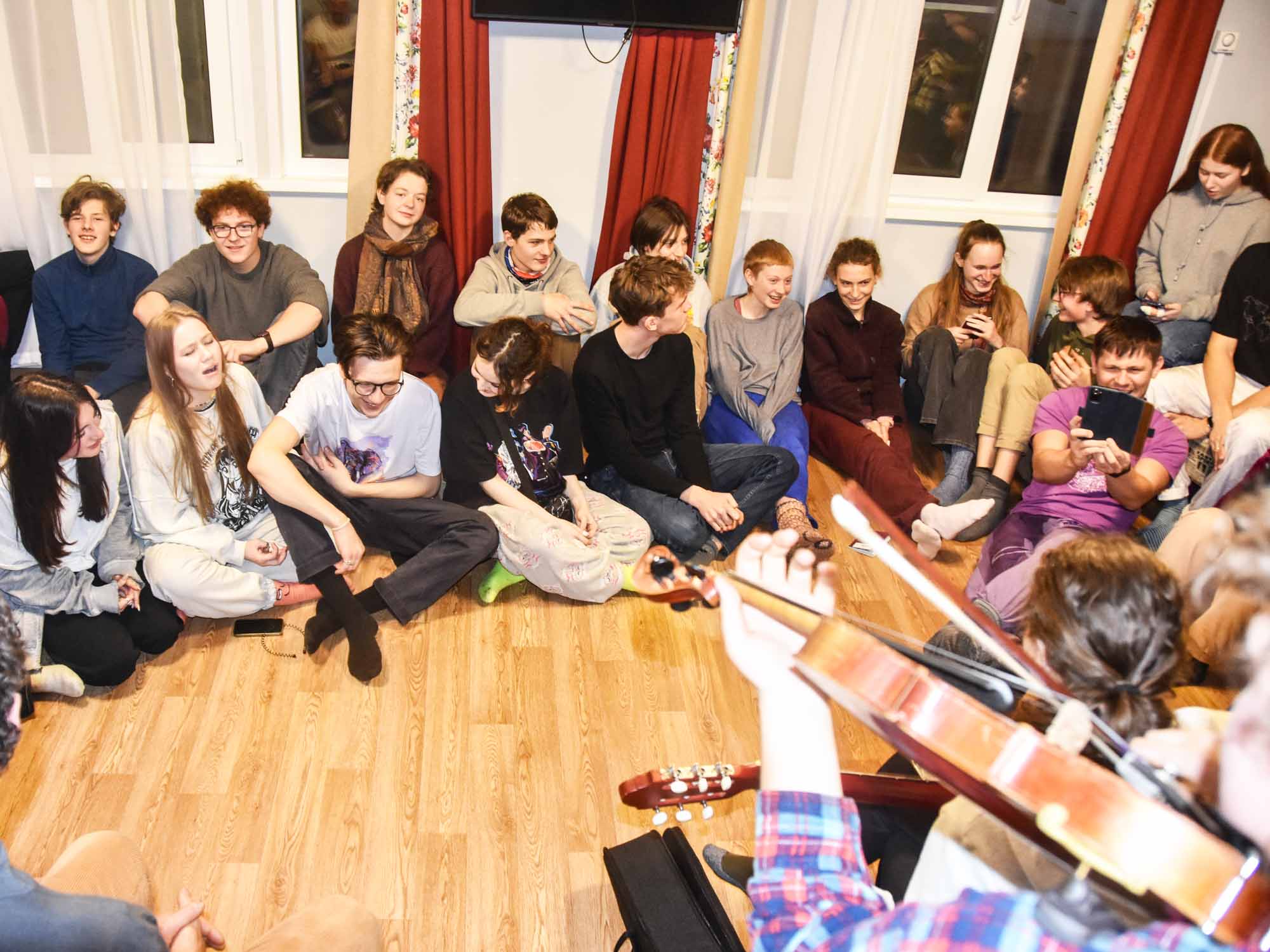 In Northern Russia, we stayed in Russian-German community houses, ten people per house. We worked together in the mornings, and in the afternoons, we had outings in the area, visited the ‹banya› (Russian sauna), or went skiing. The long evenings were spent together in smaller or larger groups. We sang German and Russian songs together, laughed, played, chatted, learned from instructive presentations, and practiced communal dances accompanied by guitar and violin. Helped by this diverse program, close connections were forged between the German group and around 30 Russian students.