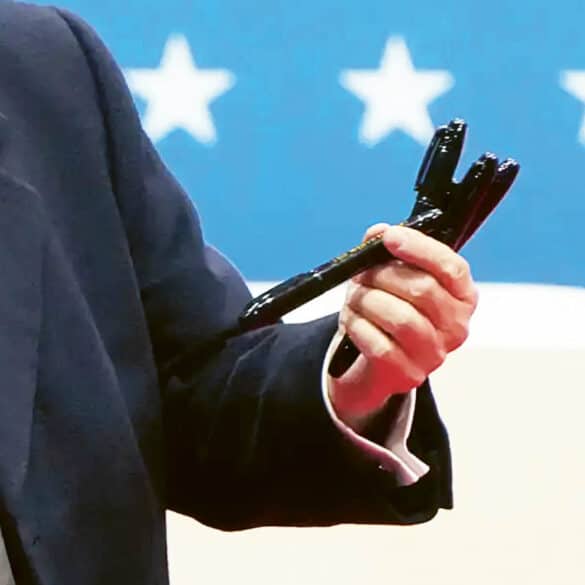 An image for the history books: the new US president signs stacks of presidential decrees in a baseball arena as...