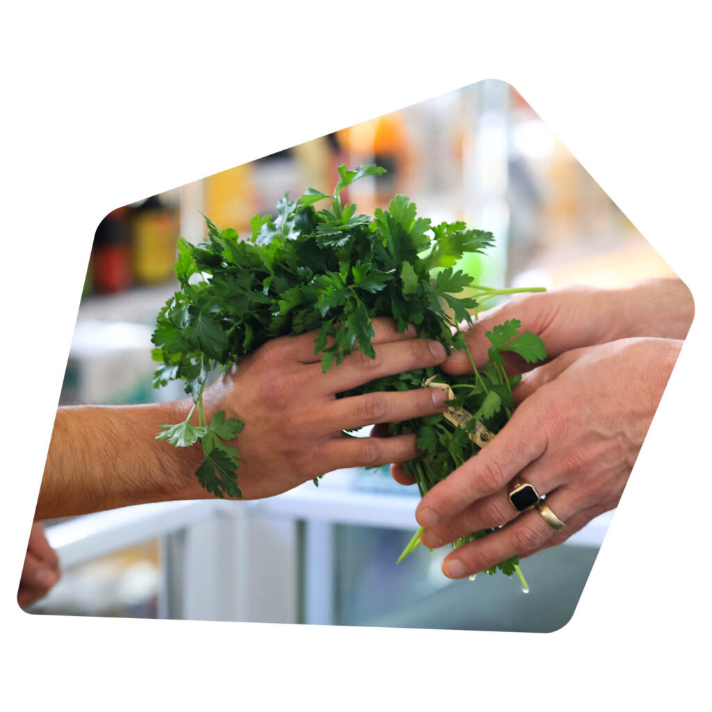 There’s also a program that New York state runs called Double Up Food Bucks. For every dollar of groceries that you buy, you get $1 of free fruits and vegetables, up to $20. So, you can get your meat, your fish, your eggs, your everything, and if you spend over $20, then you get $20 of fruits and vegetables. Now, $20 of fruits and vegetables is a lot, and that’s every time you come in the store! At the end of the month, we get a reimbursement check from Double Up Food Bucks. What’s special is that to get this benefit, people have to already be getting food stamps (financial assistance from the government). And it’s very interesting: people who are really struggling say, I’m going to use my food stamp card for X, Y, and Z, and then my Double Up Food Bucks card for my fruits and vegetables—they know exactly what they’re spending and how to stretch their budget. So this is really helpful to them.