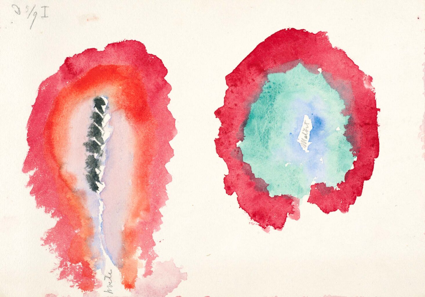 When practiced long enough (which can vary for each person), these exercises aim to build inner, spiritual organs of clairvoyance (the chakras or lotus flowers) that will enable one to experience the invisible astral plane (“soul world”) that lies behind the world we experience with our ordinary senses. Then the meditant will become aware of certain “forms of feeling,” attached to each process, that is, astral forms, lines, and figures associated or expressive of each of the two contrasting phenomena of the living world of nature, especially in plants. Some of Hilma af Klint’s paintings from this 1922 series of watercolors seem to show these opposite “botanical” phenomena: