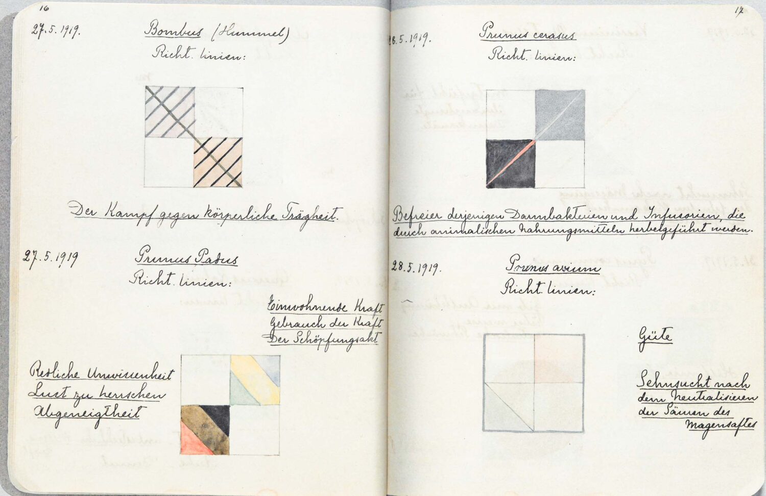 In these diagrammatic plant pictures from 1919-1920, we seem to see elemental forces, colors, structures, and tendencies that expand and contract. We don’t know why she so often employed a quadrant format within the square or oval shapes depicting the plants’ “directional lines.” Perhaps they represent four levels of reality in which the plant exists or maybe four stages of plant growth.