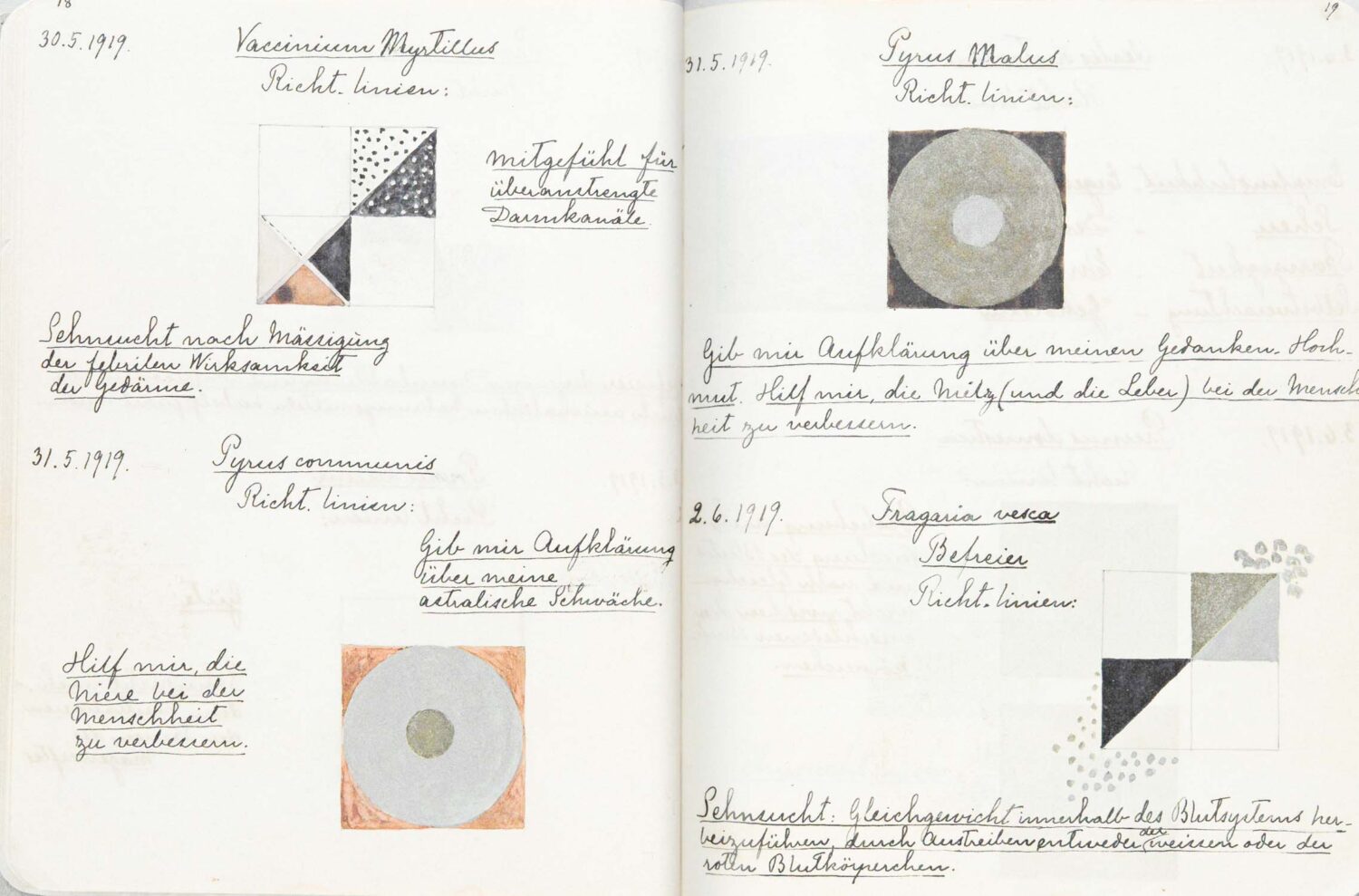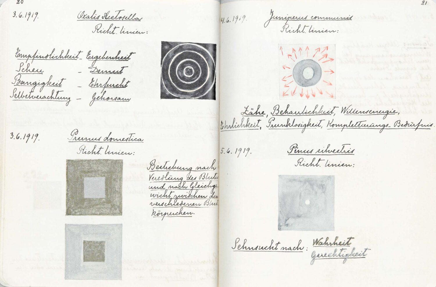 All of these studies employed a combination of careful meditative observation, clairvoyant perception, and artistic expression – titled Flowers, Mosses, and Lichens. For these botanical studies, she developed an unusual threefold diagrammatic language to capture the qualities of each plant, with each species given either a full or half page, reflecting a very different way of experiencing nature than that used in classical botany:
