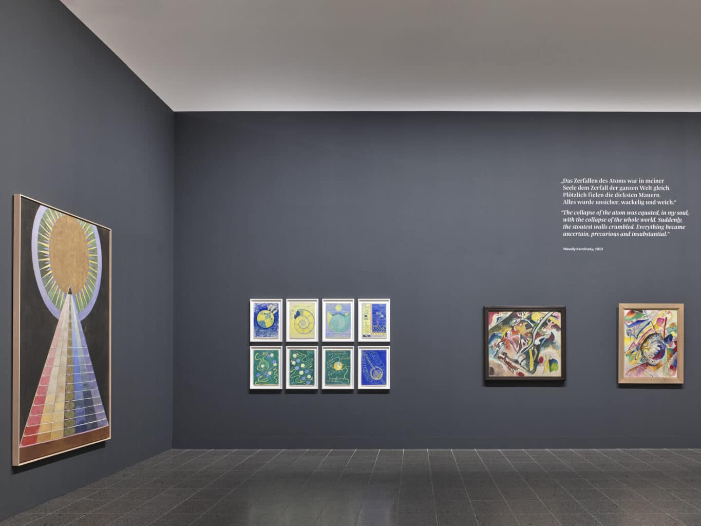 On display are af Klint’s complete cycle from 1907: “The Ten Largest” (so-called, but actually her largest paintings measure 10.5 x 7.75 ft [320 x 240 cm]), supplemented by smaller cycles from the 1910s, and Kandinsky’s three large key works from 1911, 1923, and 1939, from his own collection and numerous others, some of which are from remote provenance.