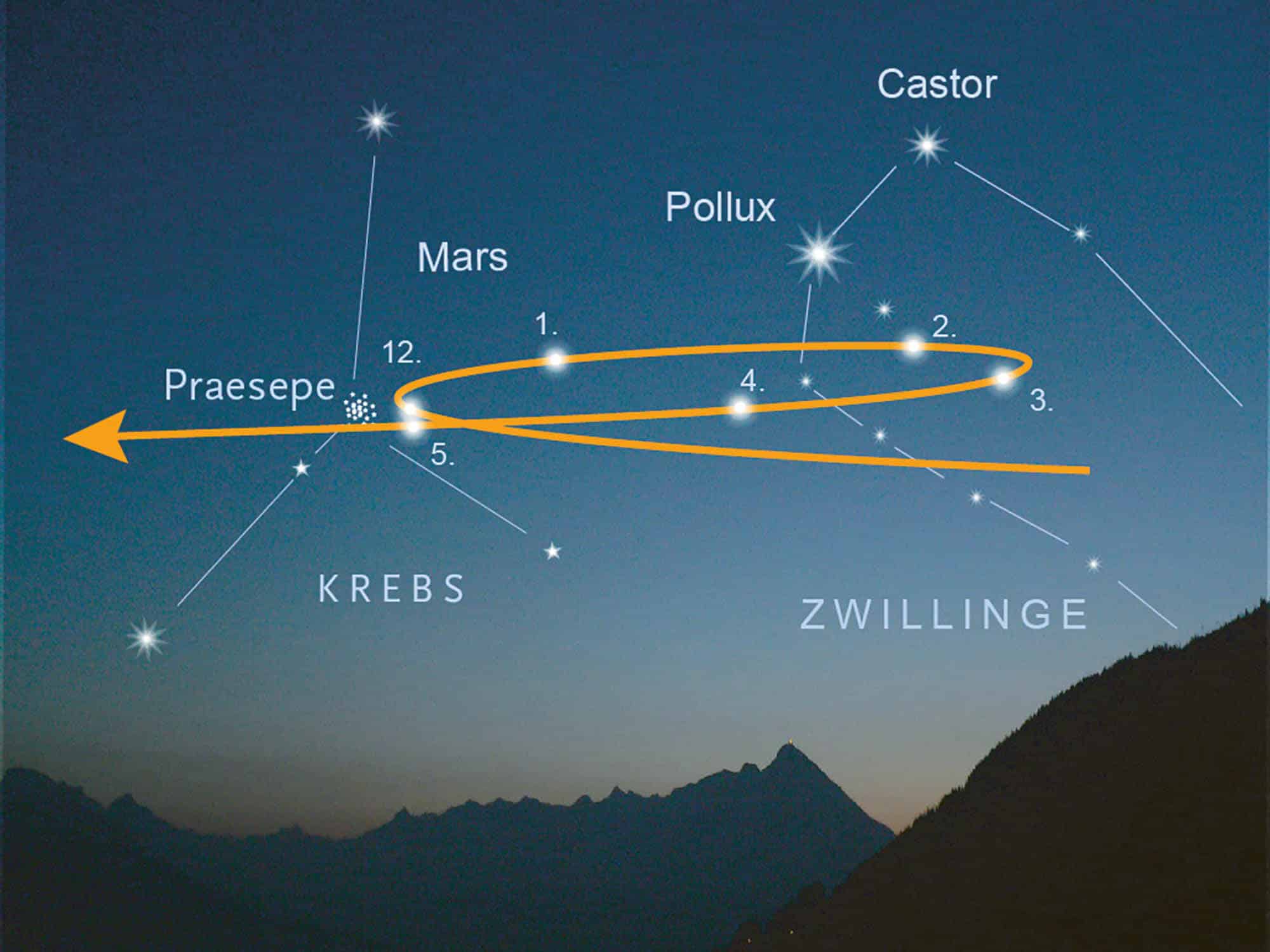 Image Mars moving between Cancer (Krebs) and Gemini (Zwillinge). Source: Sternkalender 2025/26