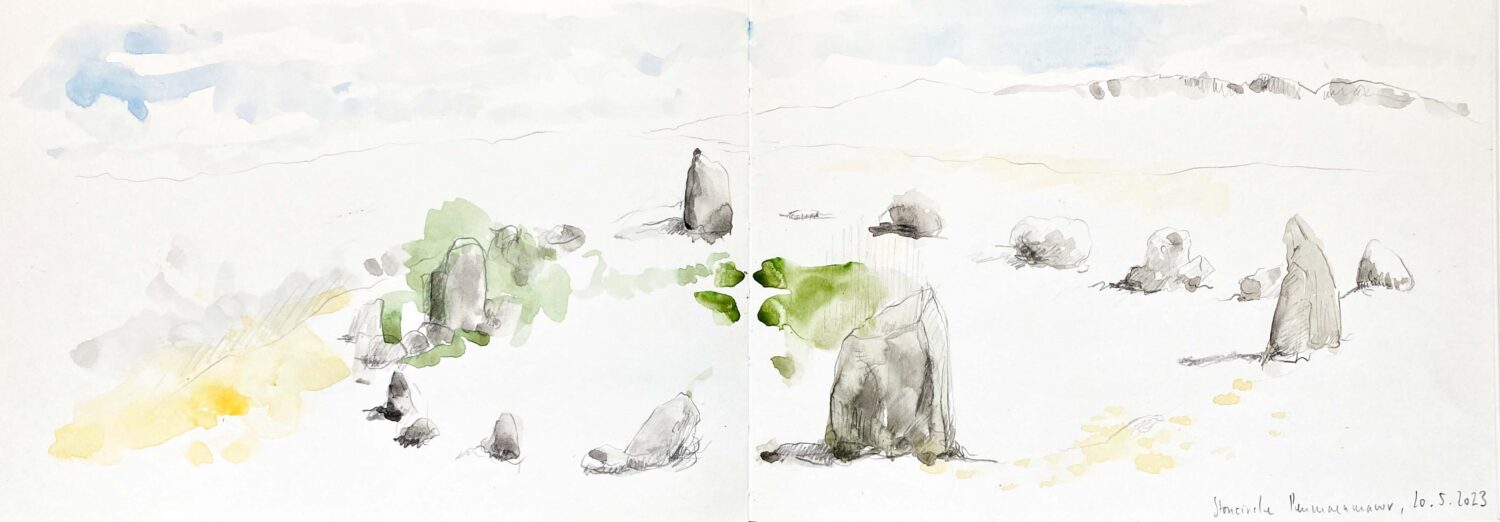 Beginning on Ascension Day 2023, the Visual Art Section, in collaboration with the Anthroposophical Society in Great Britain, held a conference called The Inspirations of the Megalithic Culture and the Future Impulse of Anthroposophy. It did not take place in Penmaenmawr (the venue of the 1923 Summer School no longer exists) but in nearby Conwy. The heart of the conference included three excursions to the stone circles. Nearly fifty people from different countries were guided on these treks by Rudolf Kaesbach, who is quite at home in this place. For many years, he was the leader of the Visual Arts Training Course at Emerson College and, along with his students and colleagues, frequently explored the Penmaenmawr stone circles, especially in their relationship to the landscape, discovering many parallels to the positioning of the Goetheanum in its own surroundings.5