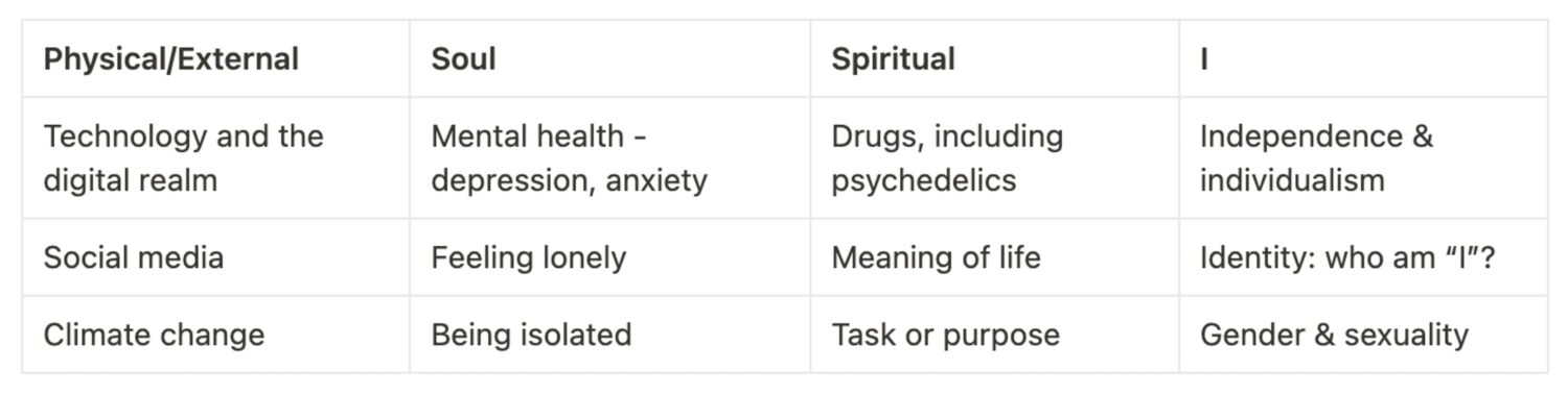 Today’s young people face the rapid advancement of technology and AI, serious political unrest in many parts of the world, the impact of the Russia-Ukraine war, and an ever-increasing cost of living. Life is accelerating, and young people are struggling to find their place and way in the world without losing their youthfulness. Our (often unconscious) search and longing for the spirit is perhaps more significant and more urgent than ever.