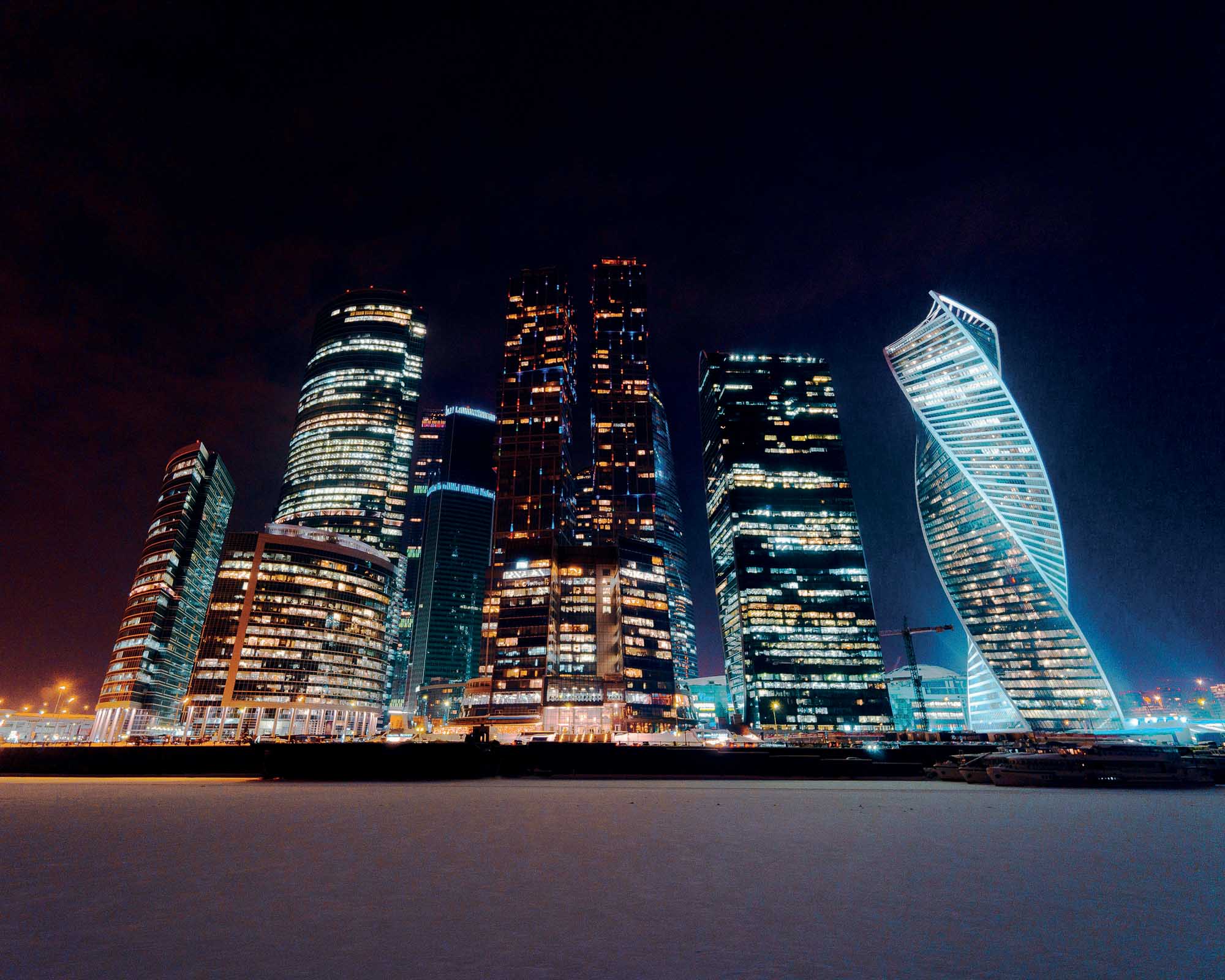 Der Evolutionsturm (rechts), zwischen 2011 und 2014 im internationalen Geschäftszentrum ‹Moskau City› vom schottische Architekturbüro RMJM gebaut, klingt mit der Kuppeldrehung der Basilius Kathedrale zusammen (siehe oben). Die zwei Gebäude wollen die Größe des Landes manifestieren. Fotografien von Nikita Karimov