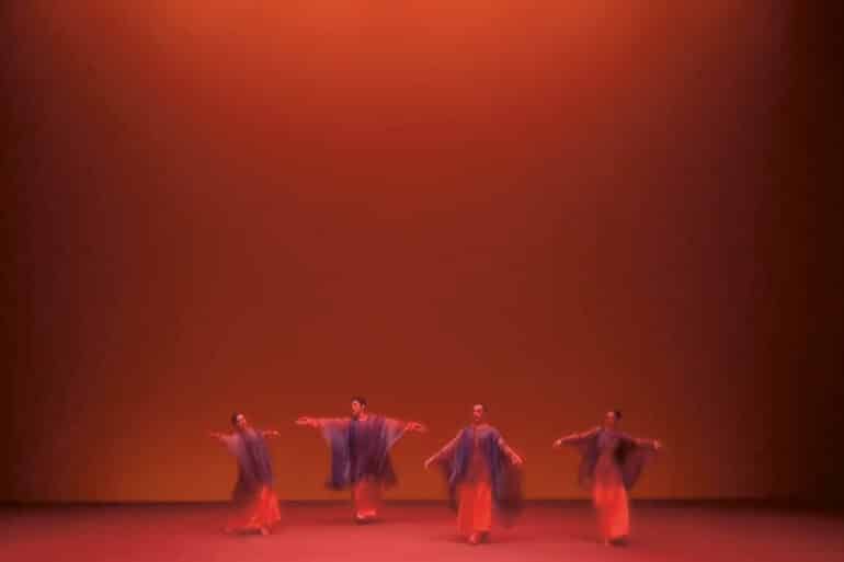 Auf der rot beleuchteten Bühne ist es still. Die Tanzenden sind nur schemenhaft im Hintergrund zu erkennen. Dann wirbeln die Körper in den Vordergrund, bringen Bewegung in das gedimmte Licht, das von Rot zu Gelb zu einem satten Türkis wechselt. Die erste Gruppe zieht sich zurück, macht Platz für weitere...