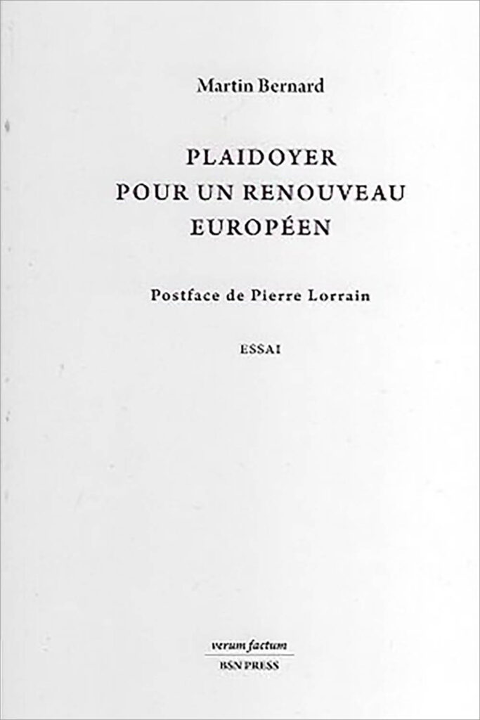 Mit seinem Werk Plaidoyer pour un renouveau européen (BSN Press, 2024) analysiert Martin Bernard die Krise Europas und schlägt Lösungen für eine Wiederbelebung vor. Er kritisiert Bürokratie und Identitätsverlust, plädiert für eine Rückbesinnung auf europäische Werte, Bürgerbeteiligung und eine spirituelle Erneuerung. Mit einer klaren Vision für ein vereintes, dynamisches Europa regt das 168-seitige Werk zur Reflexion an. Nachwort von Pierre Lorrain. ISBN: 978-2-940516-26-1.