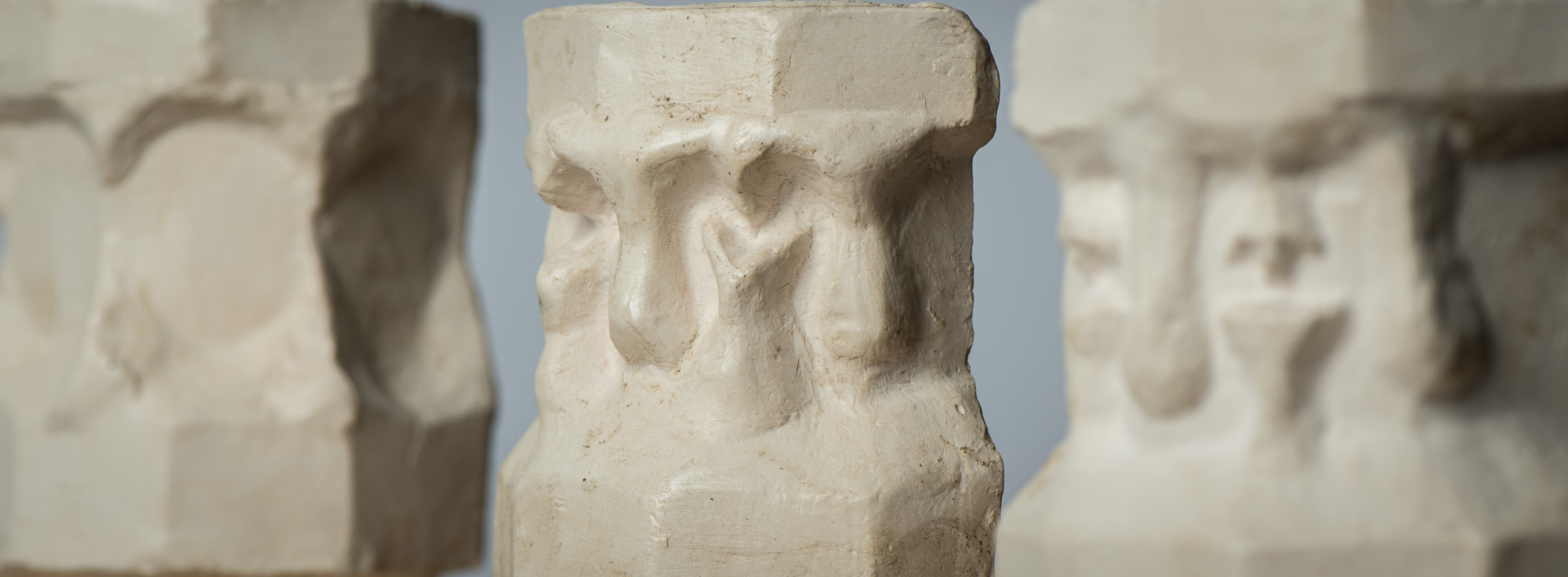 Foto: Sigrun Janiel, Gipsabgüsse der Modelle Rudolf Steiners für die in Holz geschnitzten Säulenkapitelle des großen Kuppelraumes im Ersten Goetheanum.