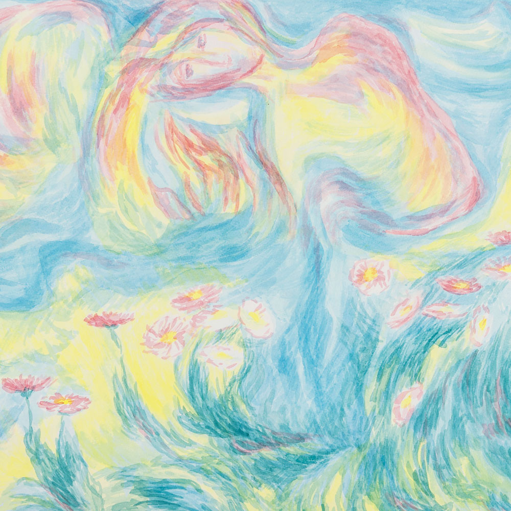 «Die habe ich während der Ausbildung in den 1980er-Jahren bei Gerard Wagner kennengelernt», meinte sie lächelnd, als ich sie in ihrem Atelier besuche. Heute geht sie ihren eigenen Weg, gibt Schicht um Schicht Raum, in dem sich Form, Bewegung und Gestalt in ihren Aquarellen bilden – als fühlten oder träumten sie sich in die Musikalität des Äthers ein, um das darin Lebende und Wirkende sichtbar werden zu lassen. Ein Bild ruft sich immer wieder in mein Bewusstsein: Ein Berg erhebt sich mächtig im Bildvordergrund, darin ruht ein Wesen mit einem morgenklaren Gesicht, hell wie der weit entfernte Horizont des Bildes. Es mahnt mich an den Weltenhumor/Berggeist des Menschheitsrepräsentanten von Rudolf Steiner, wirkt aber mütterlich, trägt es doch in seinen Armen all das, was auf dem Gestein zum Leben drängt, und verbindet es mit den fließenden Kräften der Untergründe und des Kosmos.
